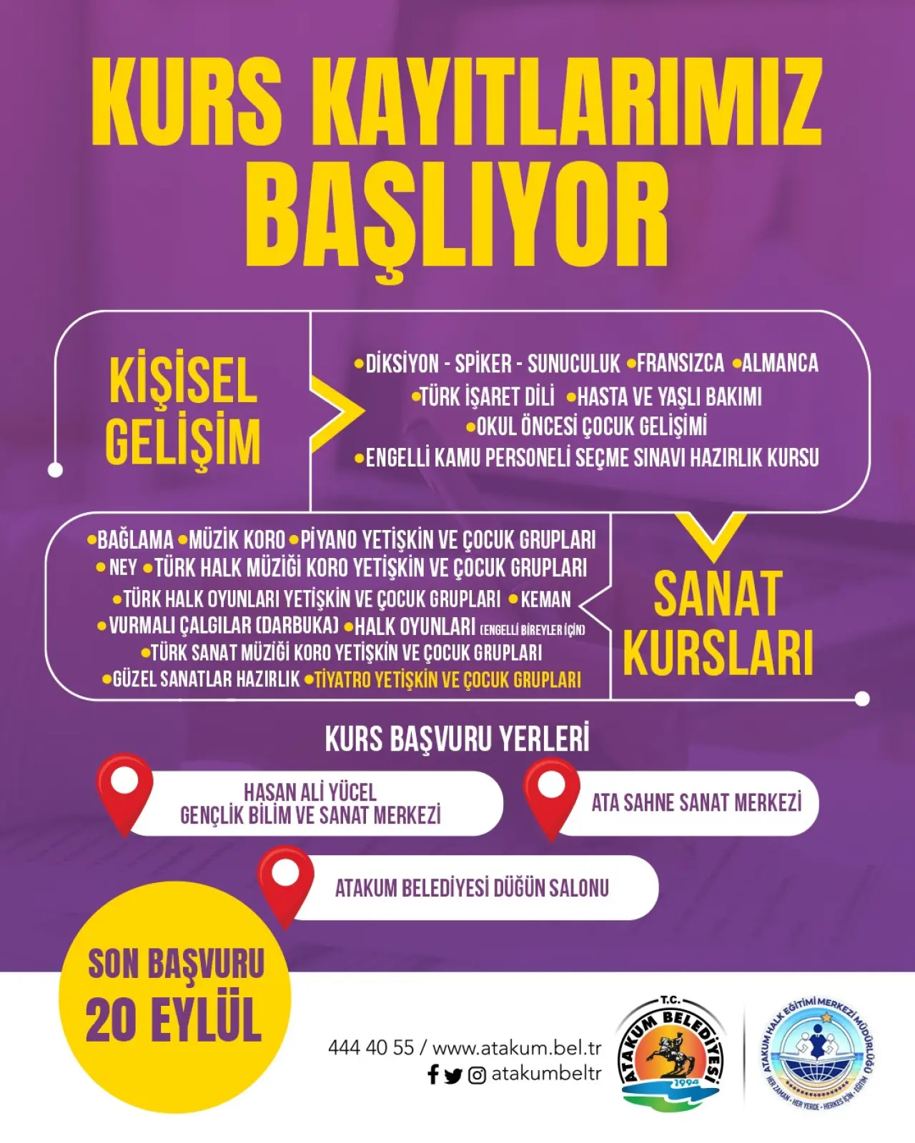 Atakum Belediyesi, Hasan Ali Yücel Gençlik Bilim ve Sanat Merkezi, Atakum Belediyesi Düğün Salonu ve Ata Sahne Sanat Merkezi’nde vatandaşlara yönelik kapsamlı kurslar düzenliyor. Kurslar, vatandaşların sanatsal, kültürel, sosyal ve kişisel gelişim ihtiyaçlarını karşılamayı hedefliyor. Başvurular, 20 Eylül Cumartesi gününe kadar gerçekleştirilebilecek.