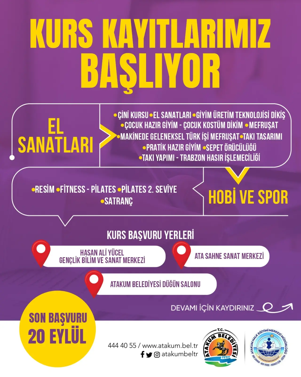 Atakum Belediyesi ile Atakum Halk Eğitim Merkezi Müdürlüğü iş birliğiyle organize edilen kurslar, el sanatları, kişisel gelişim, sanat, hobi ve spor alanlarında gerçekleştirilecek. Her kurs, alanında uzman eğitmenler tarafından yönetilecek ve katılımcıların yeteneklerini geliştirmelerine fırsat sunacak.