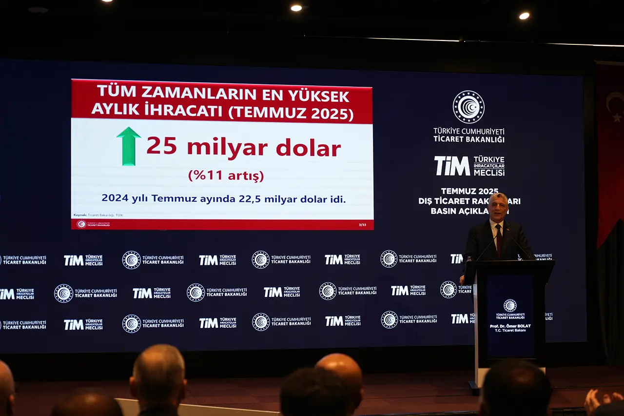 “Tüm zamanların en yüksek aylık ihracatı 25 milyar dolar. Mal ihracatı bir yıl önce Temmuz'da bu rakam 22,5 milyar dolardı. Yani üzerine tam 2,5 milyar dolar ilave ihracat eklenmiş oldu. Bu yüzde 11'lik bir artışa tekabül ediyor. Bu 2,5 milyar dolar artış son bir yıllık ihracat toplamamıza da ilave 2,5 milyar dolar kazandırmış oldu. Haziran ayı da hatırlarsanız Kurban Bayramı etkisi de vardı. İhracatımız 20,5 milyar dolardı. Demek ki 4,5 milyar dolar bir ilave sağlanmış oldu. Burada sevindirici olan 2025 yılının ilk 7 ayının altısında ihracatımızı arttırmış olduk. Rekorlarımıza bakarsanız Haziran 2022, Mart 2023, Mayıs 2024 14 ay önce kırmıştık. 24 milyar dolara ilk defa ulaşmıştık. 2 ay önce Mayıs 2025'te 25 milyar doları zorlamıştık. 24 milyar 800 milyon dolar şeklinde ve Temmuz 2025 artık 25 milyar dolar rakamına ulaştık. Bundan sonraki hedefimiz inşallah aylıkta 26'yı yakalamak. Onun için de Ticaret Bakanlığı olarak, hükümetimiz olarak, ihracatçılar ailesi olarak birlikte büyük bir mücadeleye soyunacağız.”