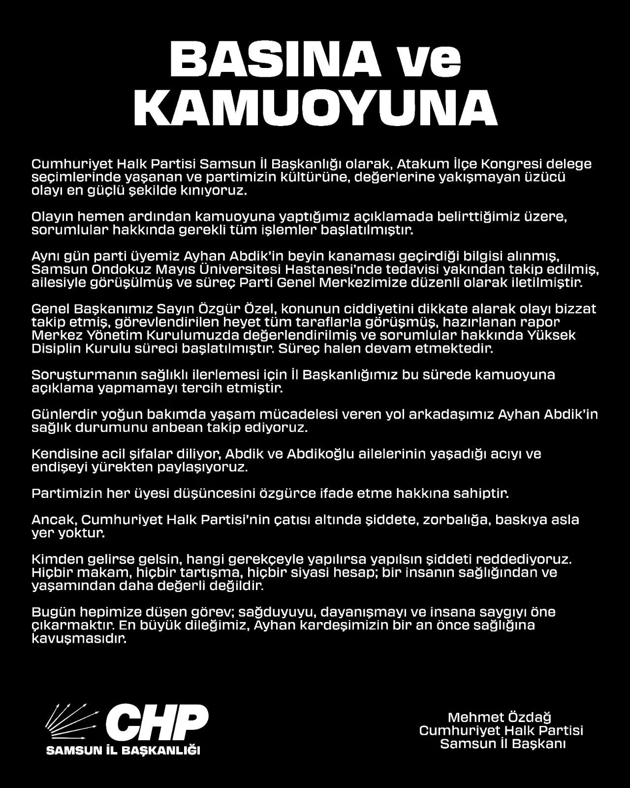 "Olayın hemen ardından kamuoyuna yaptığımız açıklamada belirttiğimiz üzere, sorumlular hakkında gerekli tüm işlemler başlatılmıştır." diyen Özdağ, "Aynı gün parti üyemiz Ayhan Abdik’in beyin kanaması geçirdiği bilgisi alınmış, Samsun Ondokuz Mayıs Üniversitesi Hastanesi’nde tedavisi yakından takip edilmiş, ailesiyle görüşülmüş ve süreç Parti Genel Merkezimize düzenli olarak iletilmiştir." şeklinde konuştu. Genel Başkanımız Sayın Özgür Özel'in konunun ciddiyetini dikkate alarak olayı bizzat takip ettiğini, görevlendirilen heyetin tüm taraflarla görüşüp, hazırlanan raporun ise Merkez Yönetim Kurulunda değerlendirilerek, sorumlular hakkında Yüksek Disiplin Kurulu süreci başlatıldığını aktaran Özdağ, "Süreç halen devam etmektedir. Soruşturmanın sağlıklı ilerlemesi için İl Başkanlığımız bu sürede kamuoyuna açıklama yapmamayı tercih etmiştir." ifadelerini kullandı.