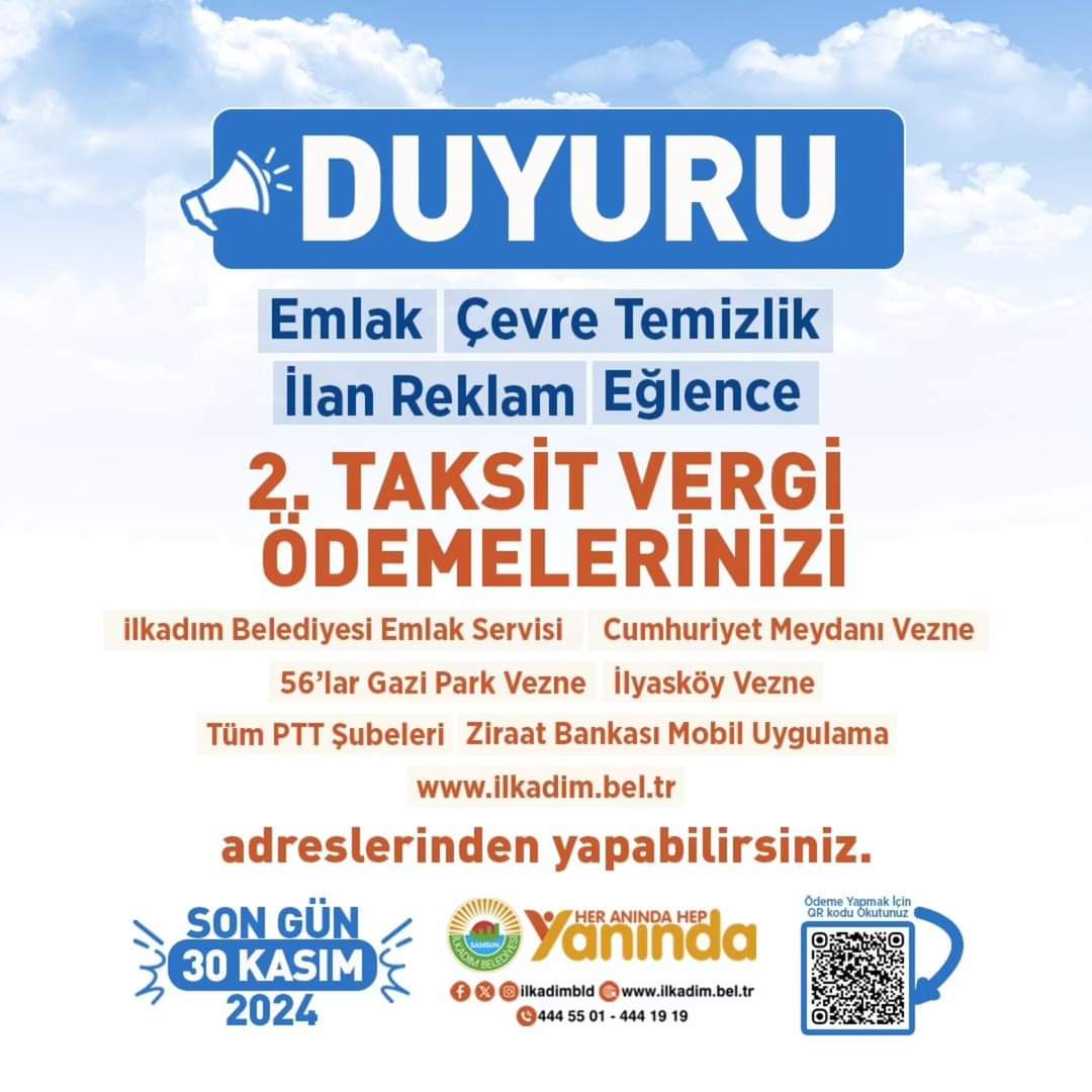 Ev, arsa ve işyeri gibi gayrimenkul sahiplerinin ödemekle yükümlü oldukları Emlak, Çevre Temizlik, İlan Reklam ve Eğlence Vergilerinin 2024 yılı ikinci taksit ödemesi, 1 Kasım 2024 tarihi itibariyle başladı. İlkadım Belediyesi Emlak Servisi, vatandaşların vergi ödemelerinden dolayı mağduriyet yaşamamaları için ödemelerini zamanında yapmaları konusunda çağrıda bulundu.