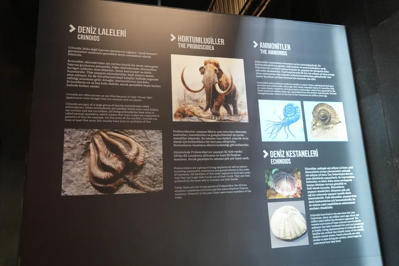 Müzede ayrıca, 66-200 milyon yıllık ammonit, 100 milyon yıllık deniz kestanesi (ekhinoid) ve 251-545 milyon yıl öncesine ait deniz lalesi gibi farklı dönemlere ait deniz canlılarının fosilleri de sergileniyor. Bu canlılar, özellikle dinozorlar ortaya çıkmadan milyonlarca yıl önce deniz ekosisteminin önemli parçalarıydı.