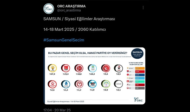 ORC Araştırma İletişim Merkezi tarafından Samsun’da 12-14 Mart tarihlerinde yapılan siyasi eğilimler araştırmasının sonuçları belli oldu. Araştırmaya 2 bin 60 kişi katıldı ve katılımcılara "Bu pazar genel seçim olsa hangi partiye oy verirsiniz?" sorusu yöneltildi.