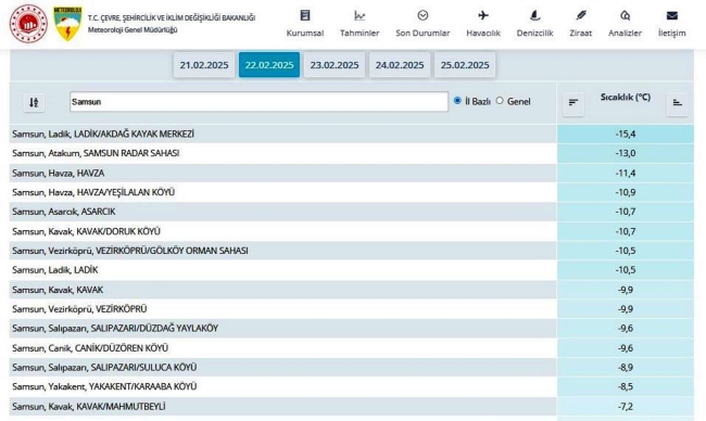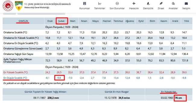 Meteoroloji Genel Müdürlüğü (MGM) verilerine göre, Samsun’da en düşük hava sıcaklığı 9 Şubat 1929'da eksi 9,8 derece olarak ölçülmüştü. Ancak 22 Şubat 2024’te Ladik'te -15,4 dereceye, Atakum’da ise -13 dereceye kadar düşen sıcaklıklar, geçmişin en düşük seviyelerini geride bıraktı. Kar kalınlığı ise Ladik'te 100 santimi, Salıpazarı'nda ise 120 santimi buldu. Bu rekorlar, şehrin tarihte gördüğü en sert kış koşullarını işaret ediyor.