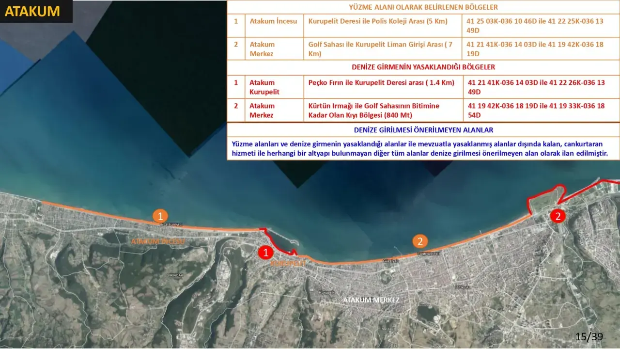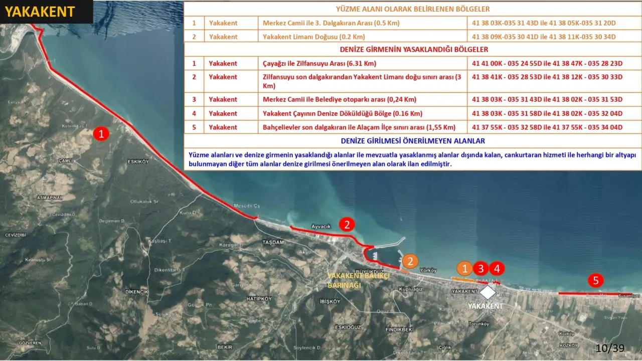Merkez Cami ile 3. dalgakıran arası (0,5 km’lik yer) ve Yakakent Limanının doğusu (0,2 km’lik bölge) “yüzme alanı” olarak tespit edildi.