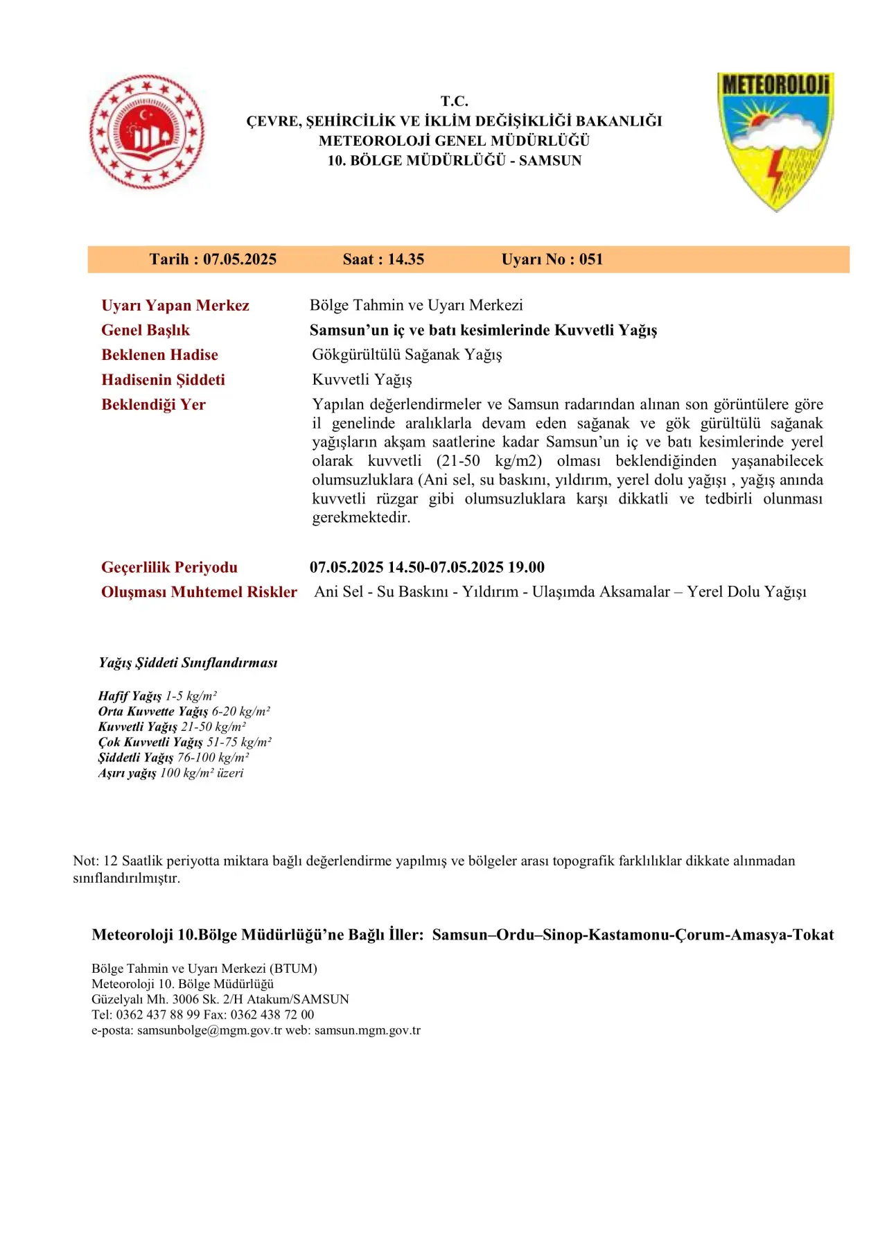 Meteoroloji 10. Bölge Müdürlüğü, 7 Mayıs 2025 Çarşamba günü saat 14.50 ile 19.00 arasında Samsun’da etkili olacak kuvvetli sağanak yağış için uyarıda bulundu. Yapılan son değerlendirmelere ve Samsun radar verilerine göre, özellikle iç ve batı kesimlerde yağışların yer yer şiddetli (21-50 kg/m²) olabileceği belirtildi.