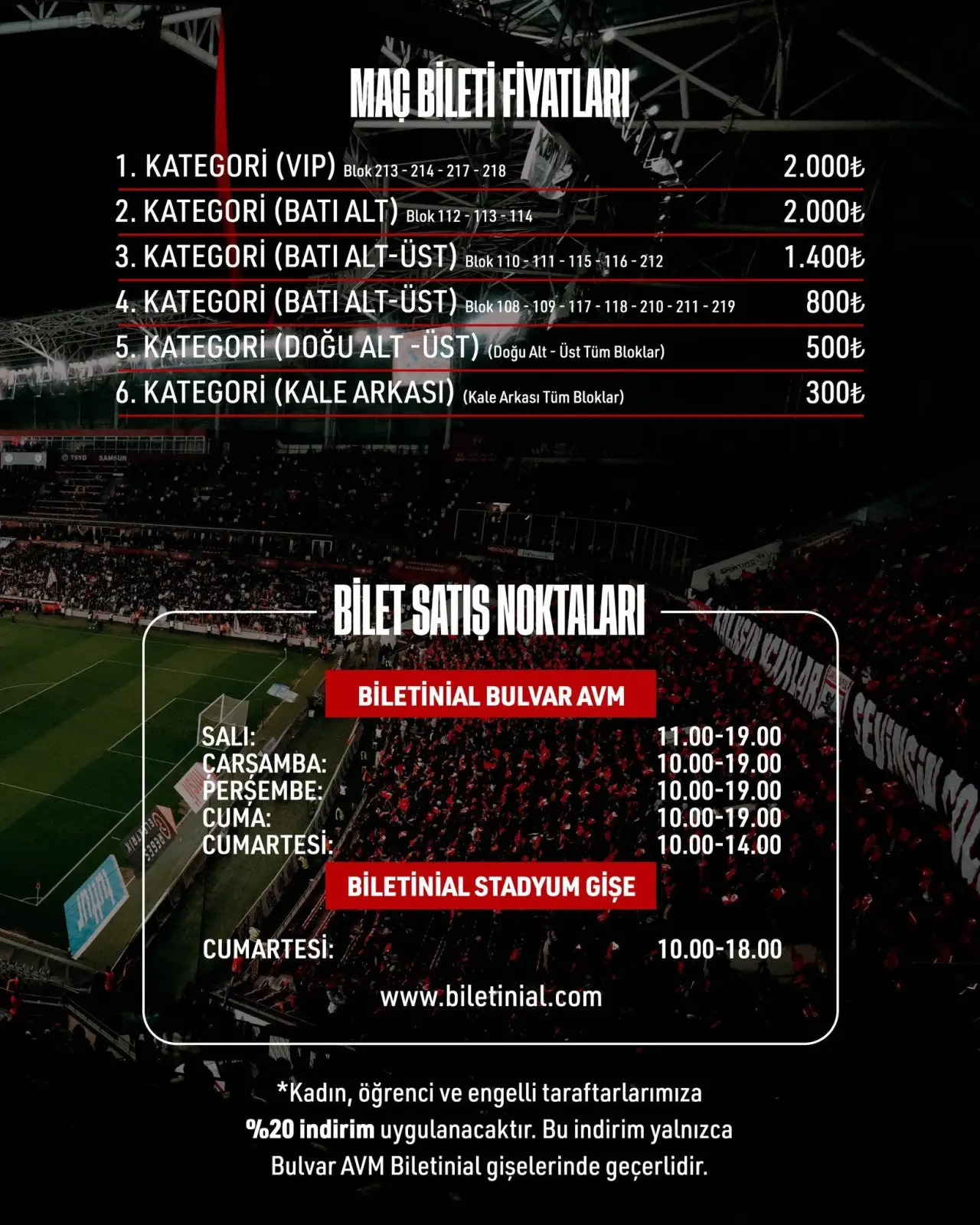 Kulüp, farklı gruplardan taraftarların maça daha kolay ulaşabilmesi için özel bir kampanya başlattı. Bulvar AVM Biletinial gişesinden yapılacak alımlarda kadın, öğrenci ve engelli taraftarlara tüm tribünlerde yüzde 20 indirim uygulanacak. Bu indirim sayesinde taraftarlar, uygun fiyatlarla maçı izleme fırsatı bulacak. Samsunspor Yönetimi, kampanyanın maç gününe kadar devam edeceğini ve sınırlı sayıda bilet için geçerli olacağını duyurdu.