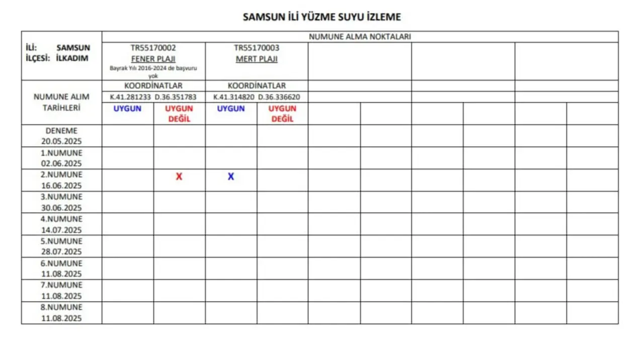 Samsun'da, Bandırma Plajı, Mert Plajı, Fener Plajı, Çelik Sitesi Plajı, Tarım Müdürlüğü Kontrol Laboratuvarı Önü Plajı, Mercan Plajı, İncesu Plajı, Altınkum Plajı, Çatalçam Polis Okulu Sahil Plajı, Taflan Un Fabrikası Sahil Plajı, Deniz Kızı Plajı, Palmiye Plajı, Omtel Otel Plajı, Dantel Plajı, İnci Plajı, Nazar Plajı, Gençlik Plajı, Güzel Yalı Plajı, Marina Plajı, Körfez Plajı, Golf Plajı, Denizevleri Plajı, 6050. Sokak Hizası Sahil Plajı, Çakırlar Korosu Hizası Plajı, Yalı Plajı, Kumcağız Plajı Dereköy Bahçelievler Plajı, Koşu Mahallesi 4. Mendirek Arkası Plajı, Geyikkoşan Öğretmenevli Sahil Plajı, Göçkün Mahallesi Alba Kent Sitesi Plajı, Et Yemez Mahallesi Eminamca Sitesi Sahil Plajı, Yalı Lokantası Sahili Plajı, Blu Sea Plajı, Geziyolu Sahili Paçoz Aile Çay Bahçesi Sahil Plajı, Hürriyet Mahallesi Anıl Plajı, Abdal Deresi Kurtuluş Mahallesi Yazlıklar Sahil Plajı, Costal Yalı Yağmur Sokak Plajı, Sahil Mahallesi Yazlıklar Plajı, Sakarlı Mahallesi Plajı, Evci Mahallesi Çamlık Alan Çevre Eğitim Plajı, Evci Mahallesi Karavan Kampı Plajı Kafeterya Karşısı, Gölyazı Mahallesi Orman Plajı'nda deniz suyu analizi yapılıyor.