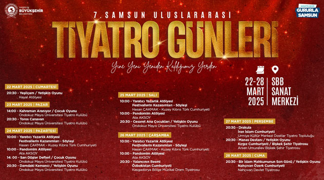 Samsun Büyükşehir Belediyesi, şehri kültürel ve sanatsal açıdan Türkiye’nin önde gelen şehirlerinden biri yapmak amacıyla çalışmalarına devam ediyor. Bu kapsamda düzenlenen 7. Uluslararası Tiyatro Günleri, her gün farklı oyun ve etkinliklerle Samsun’u sanat dolu bir festivale dönüştürecek.