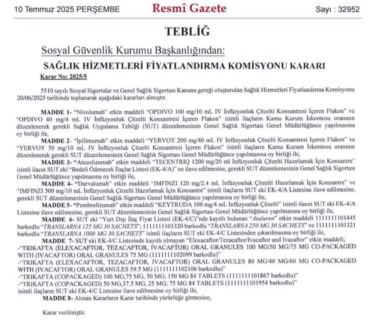 ARENA ÖZEL HABER/Samsun'da, Avukat Erman Necati Tekcan’ın yıllardır hasta yakınlarıyla birlikte sürdürdüğü hukuk mücadelesi, önemli bir kazanımla sonuçlandı. 10 Temmuz 2025 tarihli Resmî Gazete’de yayımlanan Sağlık Uygulama Tebliği değişikliğiyle, uzun süredir SGK tarafından geri ödemesi yapılmayan beş immünoterapi ilacı geri ödeme kapsamına alındı. Söz konusu ilaçlar şunlar: Keytruda (pembrolizumab), Opdivo (nivolumab), Imfinzi (durvalumab), Tecentriq (atezolizumab) ve Yervoy (ipilimumab). Akciğer, mesane ve melanom gibi agresif kanser türlerinin tedavisinde kullanılan bu ilaçlar, bugüne dek yüksek maliyetleri nedeniyle birçok hasta tarafından erişilemez durumdaydı. Geri ödeme kapsamına alınmaları, binlerce hasta için yaşamsal önemde bir adım olarak değerlendiriliyor.