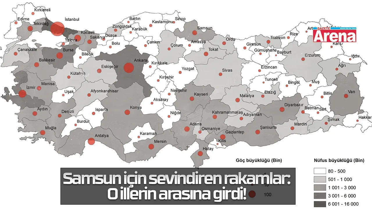 Türkiye İstatistik Kurumu (TÜİK) tarafından yayımlanan 2024 yılı iç göç istatistiklerine göre Samsun, net göç alan şehirler arasında yer aldı. Yıl boyunca 46 bin 841 kişi Samsun’a yerleşirken, 43 bin 246 kişi ise başka illere göç etti. Bu hareketlilik, şehre net 3 bin 595 kişilik bir nüfus kazandırdı.