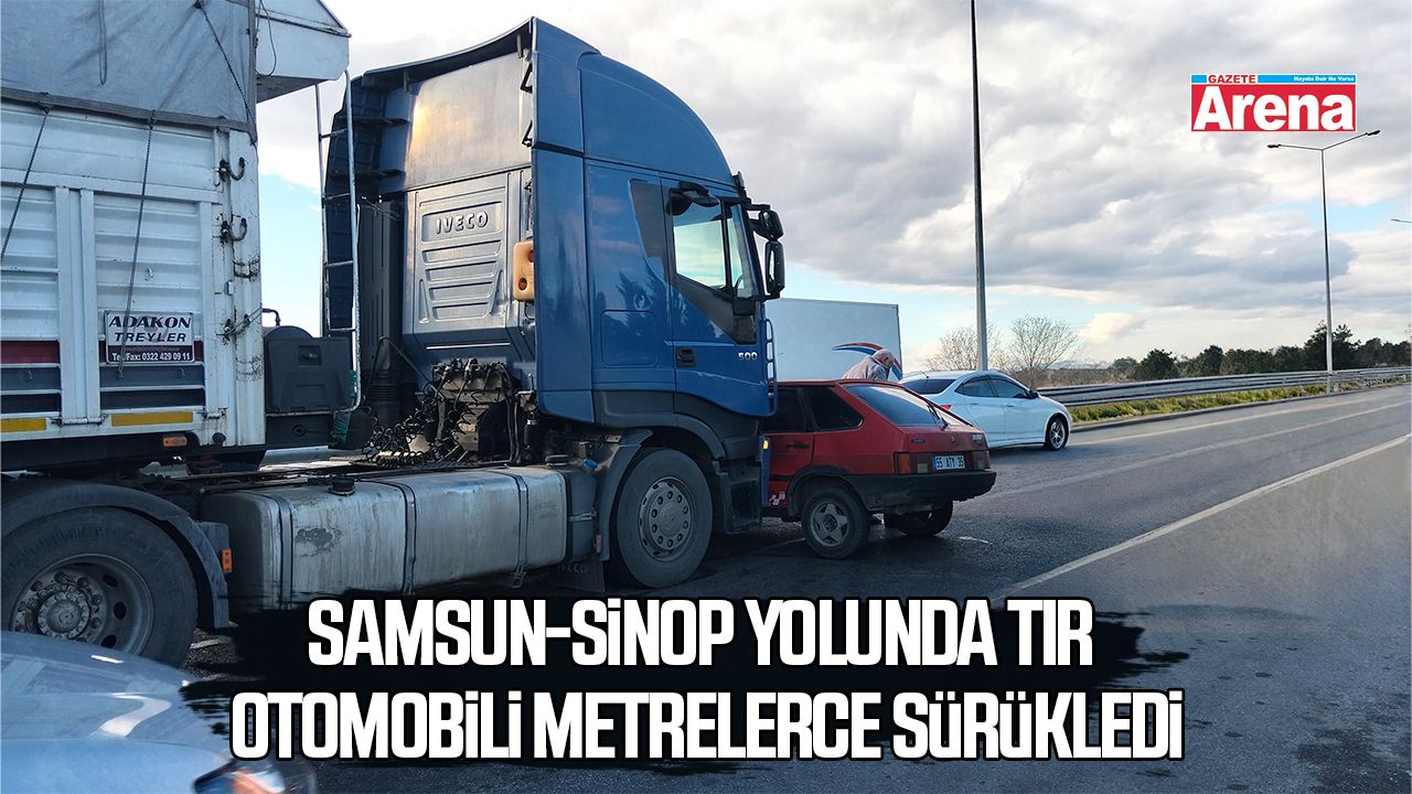 Samsun-Sinop karayolunda yaşanan kazada tır, çarptığı otomobili yaklaşık 20 metre sürükledi. Edinilen bilgiye göre, Sinop istikametine seyir halinde olan 55 NE 898 plakalı tır, aynı yönde ilerleyen 55 ATY 35 plakalı otomobile arkadan çarptı.