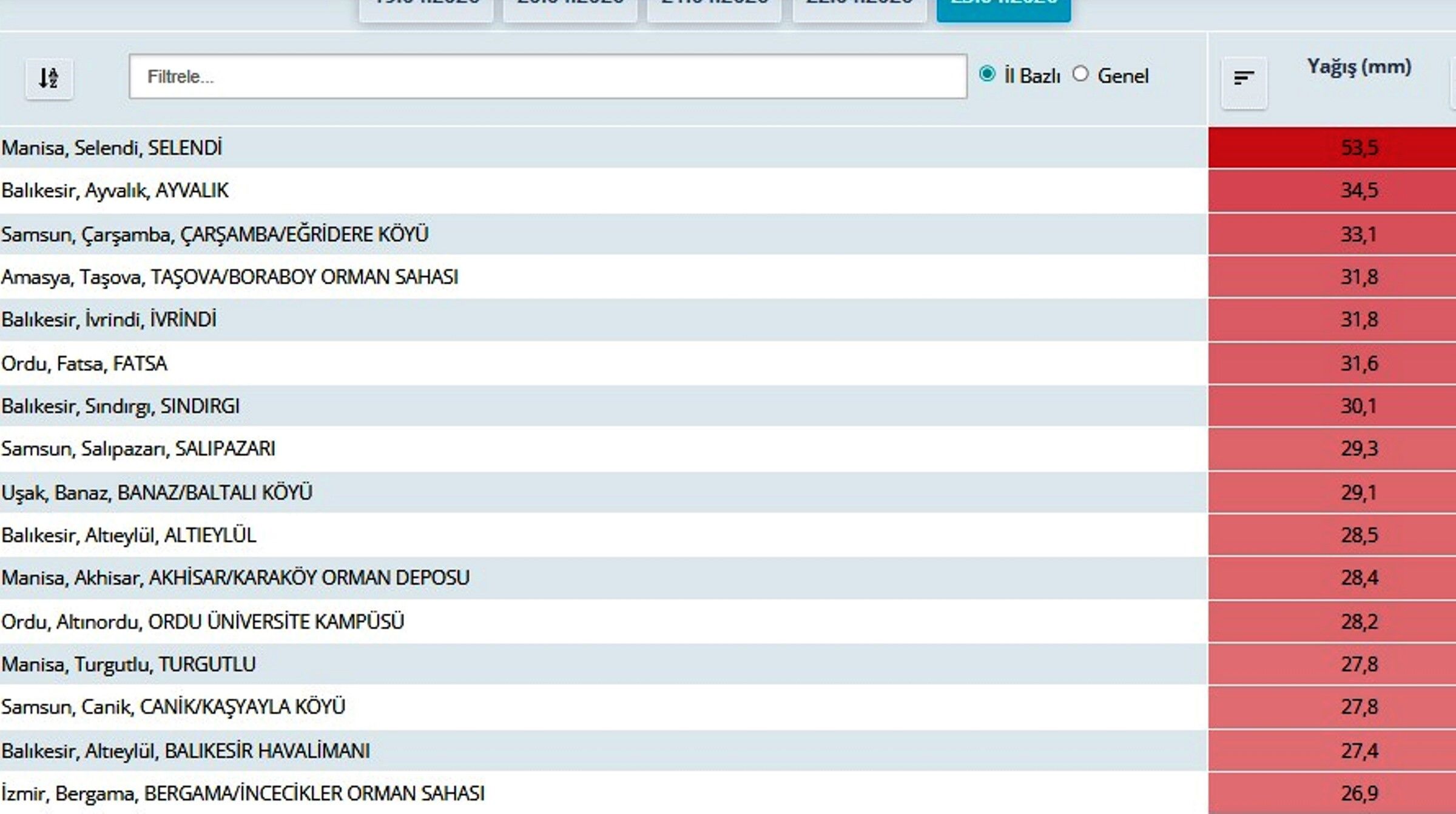 MGM’nin ölçtüğü toplam yağış verilerine göre son 24 saatte Türkiye genelinde en çok yağış alan şehir, metrekareye 53,5 kilo yağışın düştüğü Manisa olurken, onu metrekareye 34,5 kilo yağışın düştüğü Balıkesir takip etti. Samsun ise metrekareye aldığı 33,1 kiloluk yağış ile en çok yağış alan iller arasında 3. sırayı aldı.