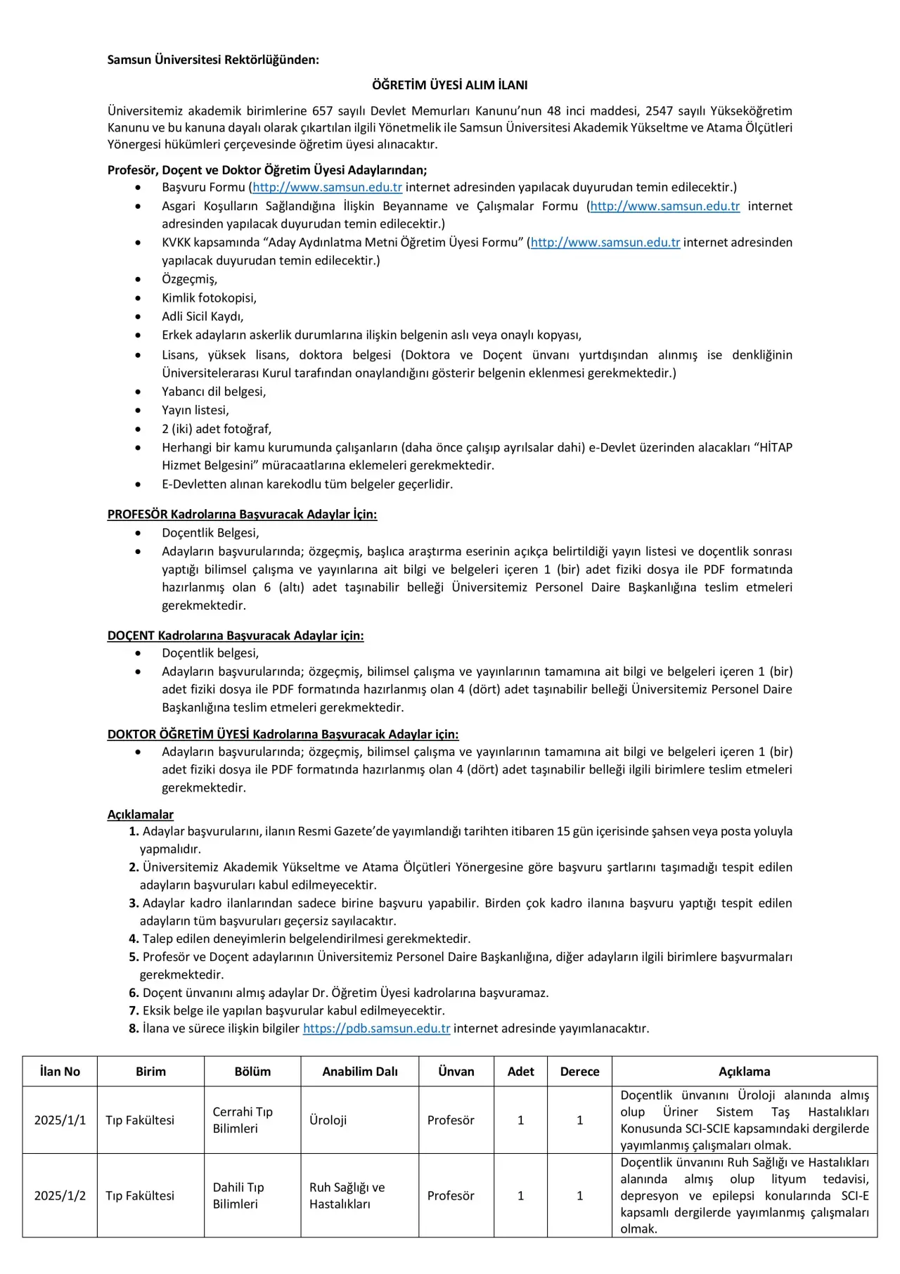 Samsun Üniversitesi, Tıp Fakültesi, Mühendislik Fakültesi, İlahiyat Fakültesi gibi farklı fakültelerden profesör, doçent ve doktor öğretim üyesi kadroları için alım yapacak. Her kadro için farklı akademik nitelik ve uzmanlık alanları belirlenmiş olup, başvuracak adayların bu alanlarda akademik deneyim ve yayınlara sahip olmaları bekleniyor.