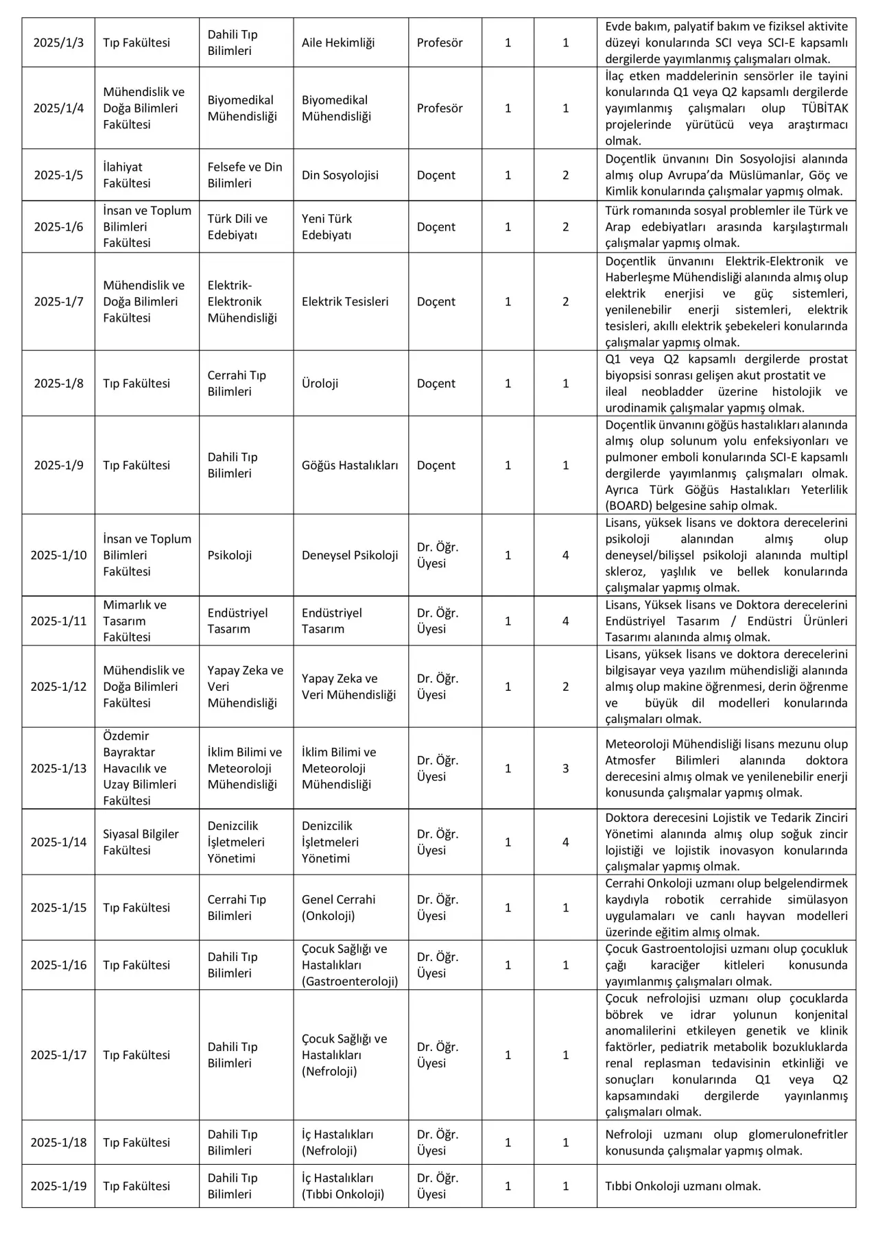• Tıp Fakültesi – Üroloji Profesörü: Üriner sistem taş hastalıkları konusunda SCI-SCIE dergilerinde çalışmaları bulunan adaylar.