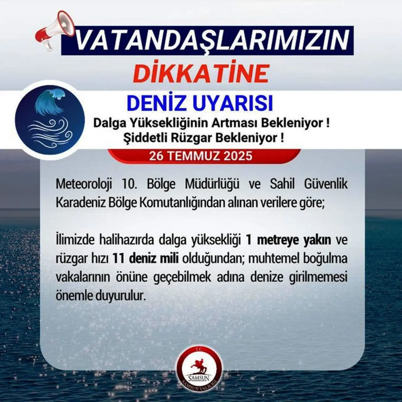 “Meteoroloji 10. Bölge Müdürlüğü ve Sahil Güvenlik Karadeniz Bölge Komutanlığı'ndan alınan verilere göre; ilimizde halihazırda dalga yüksekliği 1 metreye yakın ve rüzgar hızı 11 deniz mili olduğundan, muhtemel boğulma vakalarının önüne geçebilmek adına denize girilmemesi önemle duyurulur.”