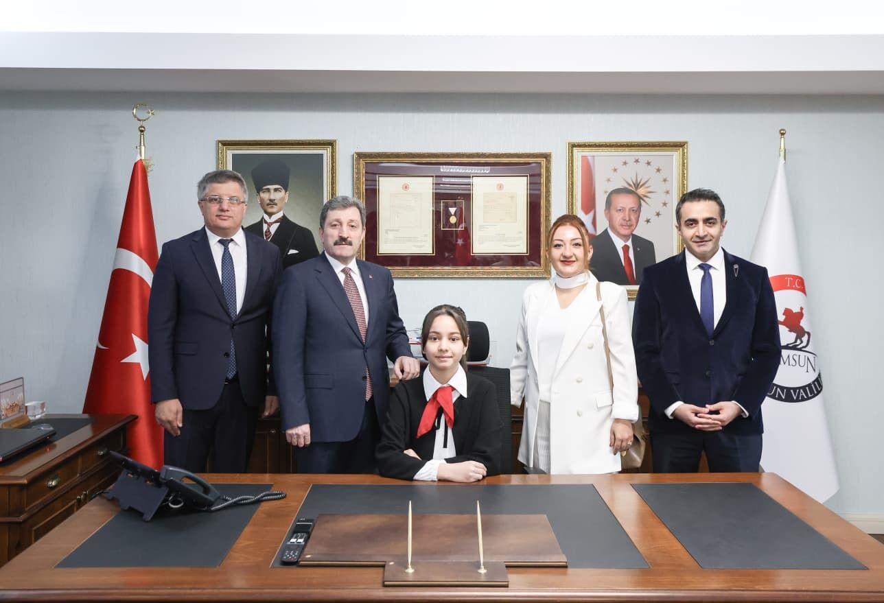Samsun Valisi Orhan Tavlı, bu özel gün vesilesiyle Samsun’un, Türkiye’nin ve dünyanın tüm çocuklarının 23 Nisan Ulusal Egemenlik ve Çocuk Bayramı'nı tebrik etti. Makam koltuğuna oturan 7. sınıf öğrencisi Diclenur Karahisar’a İl Milli Eğitim Müdürü Dr. Murat Ağar, Okul Müdürü Gökhan Ömür Özsoy ve öğretmeni Nevin Fener eşlik ederek günün anısına hatıra fotoğrafı çektirdi. Vali Tavlı, çocukların geleceğin teminatı olduğunu ifade ederek ziyaretten duyduğu memnuniyeti dile getirdi.