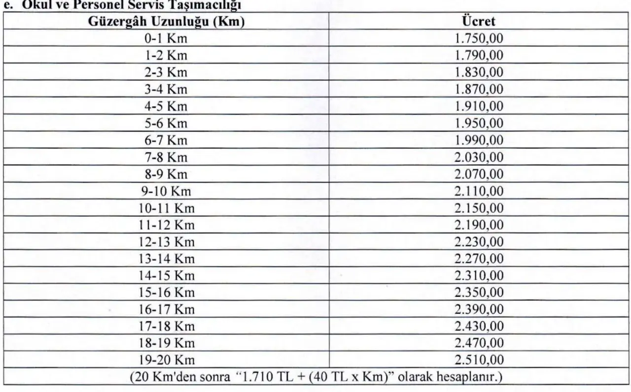 20 km üzeri mesafeler ise 1.710 TL + km başına 40 TL şeklinde hesaplanacak.