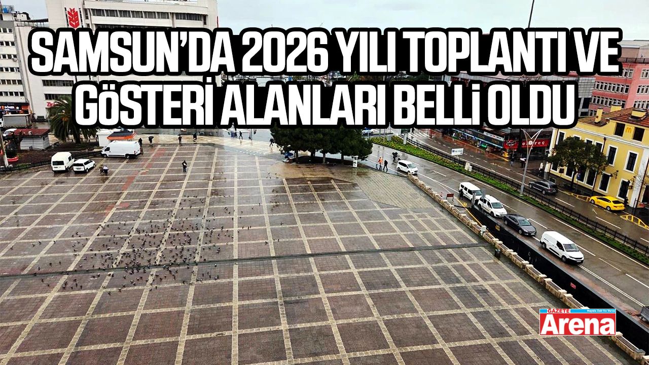 Samsun'da, 2026'da kullanılacak toplantı alanları, gösteri yürüyüşü güzergahları ile afiş ve pankart asma yerleri belirlendi. Samsun Valiliği tarafından yapılan açıklamada, İlkadım ilçesinde Cumhuriyet Meydanı ve Tütün İskelesi, Atakum ilçesinde Amfi Tiyatro, Kent Meydanı, Çobanlı Halk İskelesi, Canik ilçesinde, Doğupark Tenis Kulübü yanı, Tekkeköy'de ise Tekkeköy Belediyesi arkası açık otopark yeri toplantı alanı olarak belirtildi. Açıklamada ayrıca, Samsun'da miting alanı olarak kullanılan Cumhuriyet Meydanı'nın 4 bin 750 metrekare ile 19 bin kişi kapasiteye sahip olduğu bildirildi.
