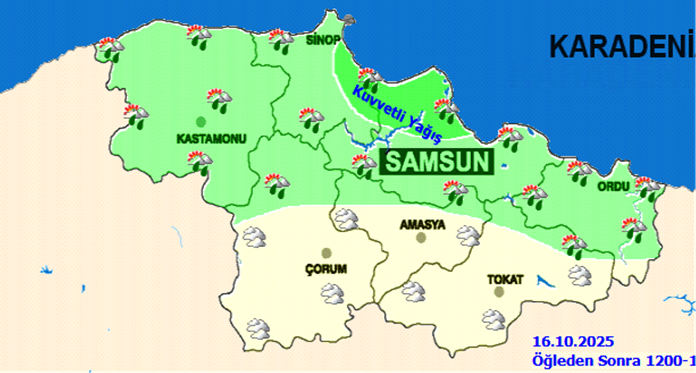 MGM'nin bölgesel hava durumu tahmin raporunda, “Samsun’un batı kıyısı ile Sinop’un doğu kıyı kesimlerinde yerel olarak kuvvetli yağış bekleniyor” denilerek vatandaşlar sel, su baskını ve ulaşımda aksamalar gibi olumsuzluklara karşı uyarıldı.