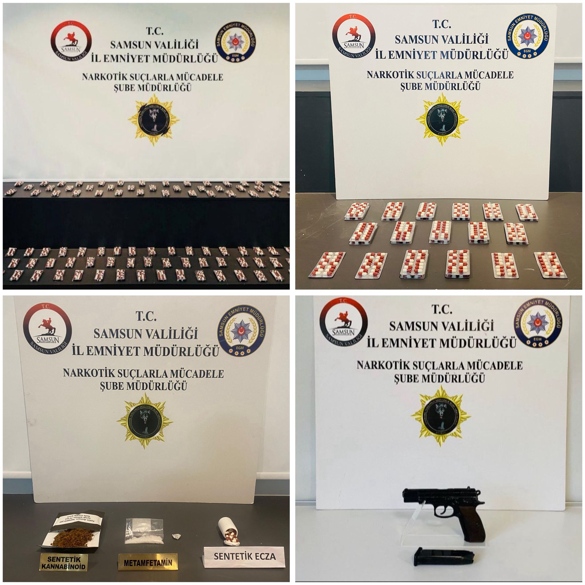 Gerçekleştirilen aramalarda 3 bin 926 adet sentetik ecza, 190 mililitre likit sentetik kannabinoid, 48 gram sentetik kannabinoid, 17 gram metamfetamin, 12,40 gram esrar tohumu ve 1,95 gram kokain ele geçirildi. Ayrıca 2 adet kurusıkı tabanca, 2 adet hassas terazi, 1 adet uyuşturucu kullanım aparatı ve 1 adet esrarlı sigara bulundu. Uyuşturucu ticaretinden elde edildiği değerlendirilen 7 bin 180 TL’ye de el konuldu.