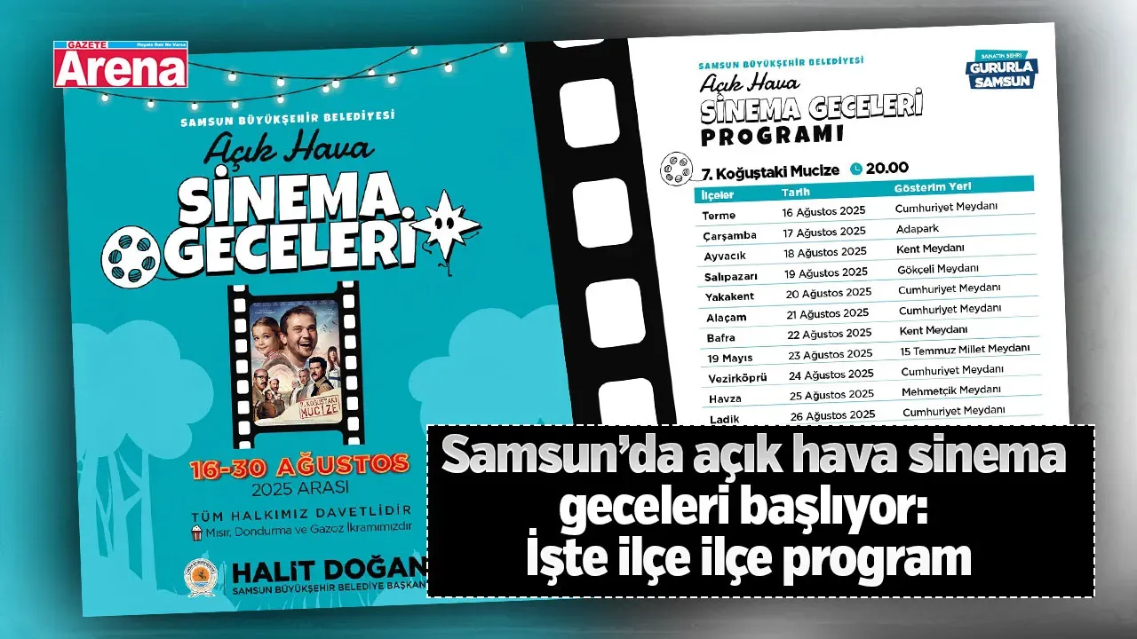 Samsun Büyükşehir Belediyesi (SBB), ilçelerde kültürel etkinliklere erişimi artırmak ve sosyal birlikteliği güçlendirmek amacıyla 16-30 Ağustos tarihleri arasında “Açık Hava Sinema Geceleri” etkinliği düzenleyecek.
