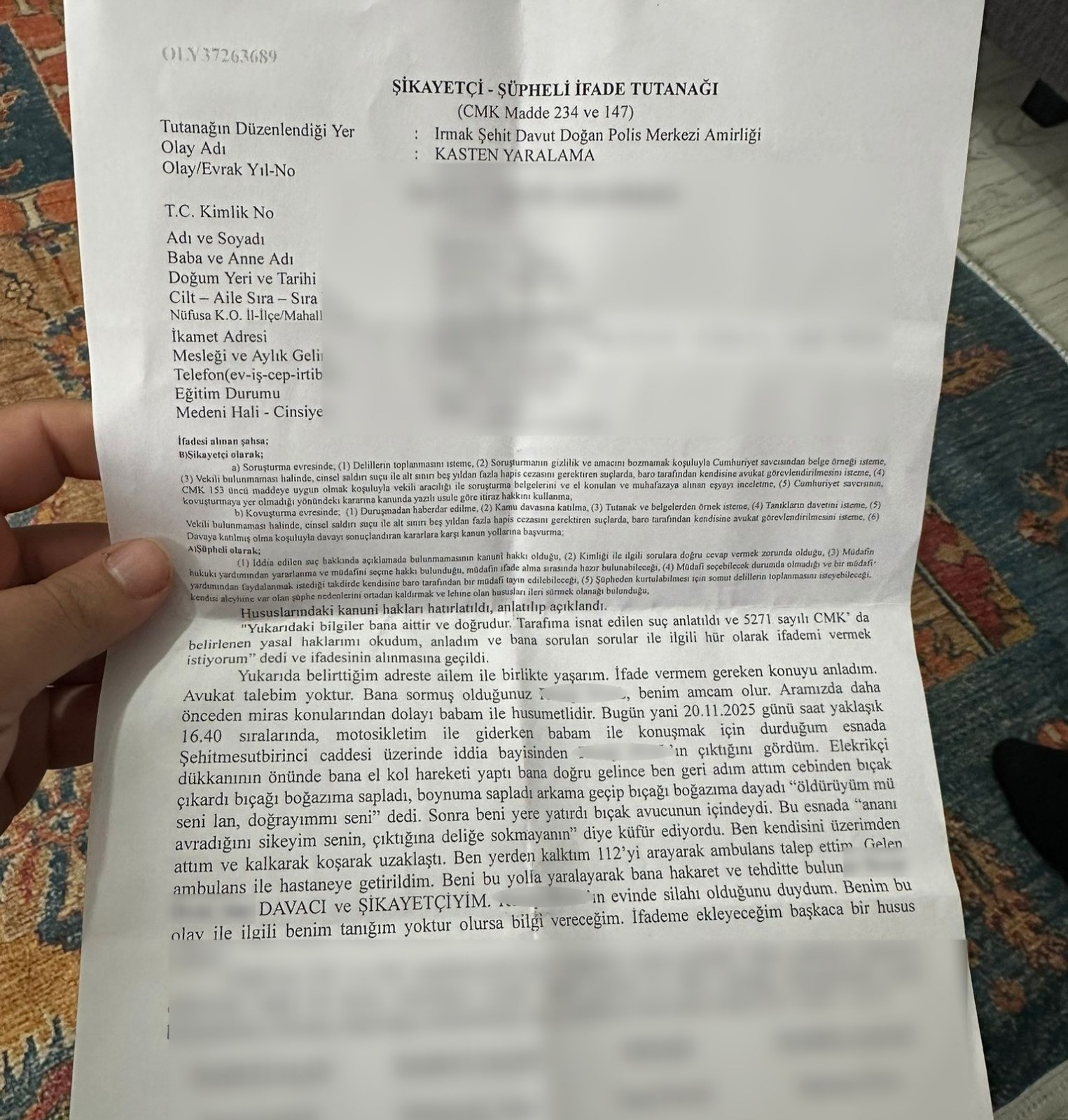 Can güvenliğinin olmadığını söyleyen İnal, "Motosikletim ile markete gidiyordum. Amcamı gördüm. Amcamla konuşmak için motosikletimi kenara çektim. Babamla arasında husumet vardı. Kaldırımın kenarında beklerken babamla telefonda konuşuyordum. Babama 'amcamı gördüm ve onunla konuşacağım, haberin olsun' dedim. O sırada amcam geldi. Amca konuşalım diye seslendim. O sırada bıçağını çekti ve ilk darbeyi boğazıma vurdu. Amca sen ne yapıyorsun demeye kalmadan, ikinci bıçak darbesini kafama vurdu. Gözüm karardı ve yere düştüm. Kendisi o da yetmiyormuş gibi üstüme gelerek 'Seni öldüreceğim, geberteceğim' gibi ifadelerle tehdit etti. Ben şikayette bulundum. Kendisi şu anda savcılık kayıtlarında tutuksuz yargılanıyor. Kendisi şu an dışarıdadır. Ben adaletin sağlanmadığını düşünüyorum. Gereğinin yapılmasını istiyorum. Benim canıma kasteden kişinin bu şekilde sokaklarda dolaşmasını istemiyorum. Bu adam gördü beni ve sorgusuz sualsiz bıçak vurdu. Belki de yarın görecek hiç yanıma yanaşmadan uzaktan tabanca ile sıkacak. Bu adam gözünü karartmış. Hiçbir şekilde art niyetimin yoktu. Kendisi durduk yere canice saldırabiliyor" ifadelerini kullandı.