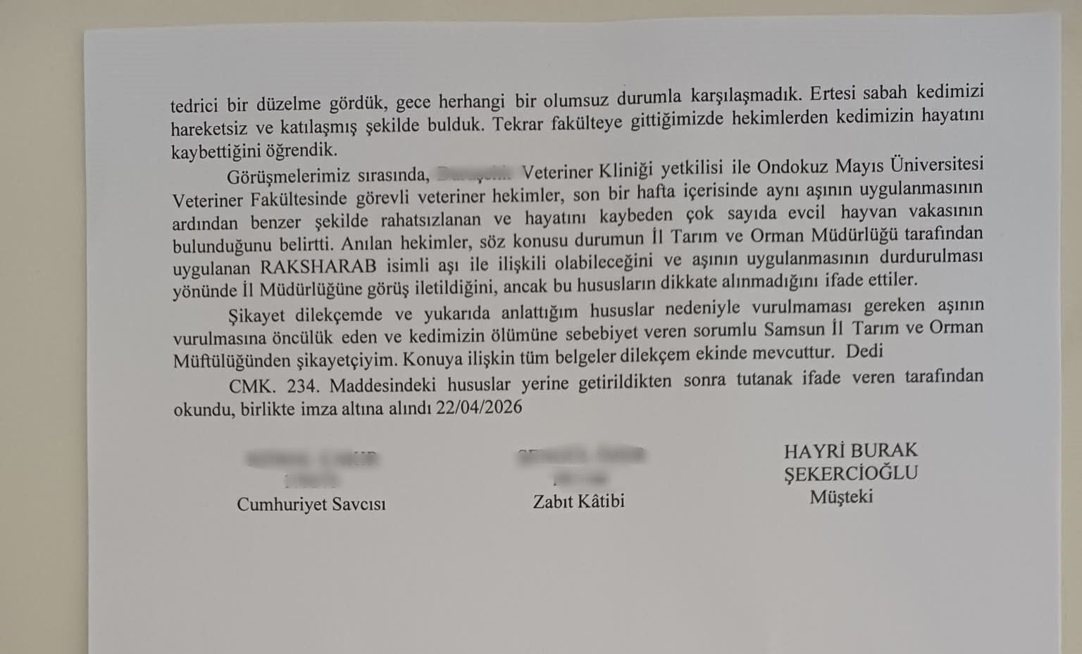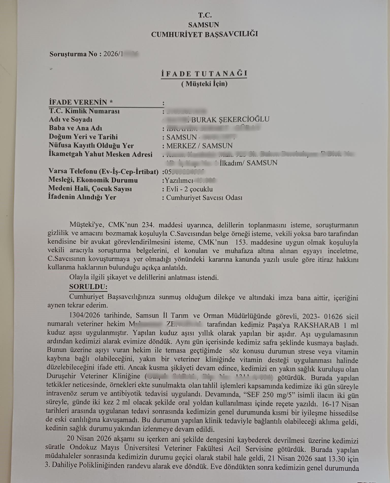 İlkadım ilçesinde yaşayan Şekercioğlu ailesinin 6 yaşındaki "Paşa" isimli British cinsi kedisi, kuduz aşısı yaptırılmak üzere Samsun Tarım ve Orman İl Müdürlüğü’ne götürüldü. Ailenin iddiasına göre Hindistan menşeili "Raksharab" isimli aşının uygulanmasının ardından kedi kusmaya başladı. İlk gün çok sayıda kusma yaşayan hayvan, veteriner müdahalesiyle kısa süreli toparlanma gösterse de birkaç gün sonra yeniden fenalaştı. Fakülte hayvan hastanesine kaldırılan kedi, tedaviye cevap vermeyerek telef oldu. Kedinin ölümü üzerine aile, birçok evcil hayvanda aynı aşı sonrası ölümlerin yaşandığı gerekçesiyle CİMER’e ve Samsun Cumhuriyet Başsavcılığı’na, Tarım ve Orman İl Müdürlüğü hakkında şikayette bulundu.