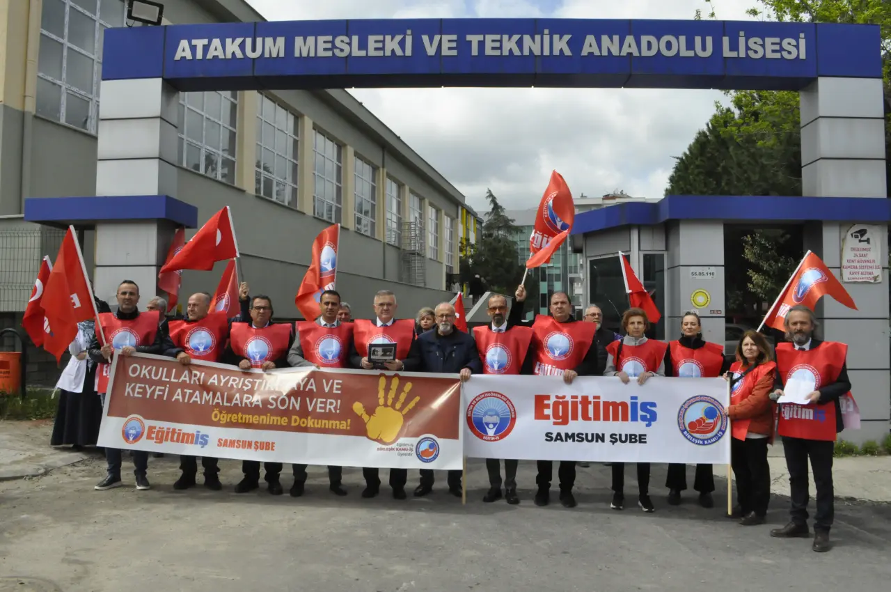 Milli Eğitim Bakanlığı'nın, "proje okul" uygulaması kapsamında aldığı yeni kararlara ilişkin ülkenin dört bir yanındaki liselerde tepkiler artarak devam ediyor. Birçok köklü okulda, öğrenciler, mezunlar, görevden alınan öğretmenlerine sahip çıkmak için eylemler başlatırken, Samsun'da da Eğitim İş Sendikası konuya ilişkin basın açıklaması yaptı. Atakum Mesleki ve Teknik Anadolu Lisesi önünde toplanan sendika üyeleri adına konuşan Eğitim İş Sendikası Samsun Şube Başkanı Onur Gündüz, "Eğitim-İş olarak biz, hiçbir öğretmenimizin yalnız olmadığını bir kez daha hatırlatıyor, bu hukuksuz atamalara karşı her türlü yasal mücadeleyi sonuna kadar sürdüreceğimizi kamuoyuna ilan ediyoruz" ifadelerini kullandı.