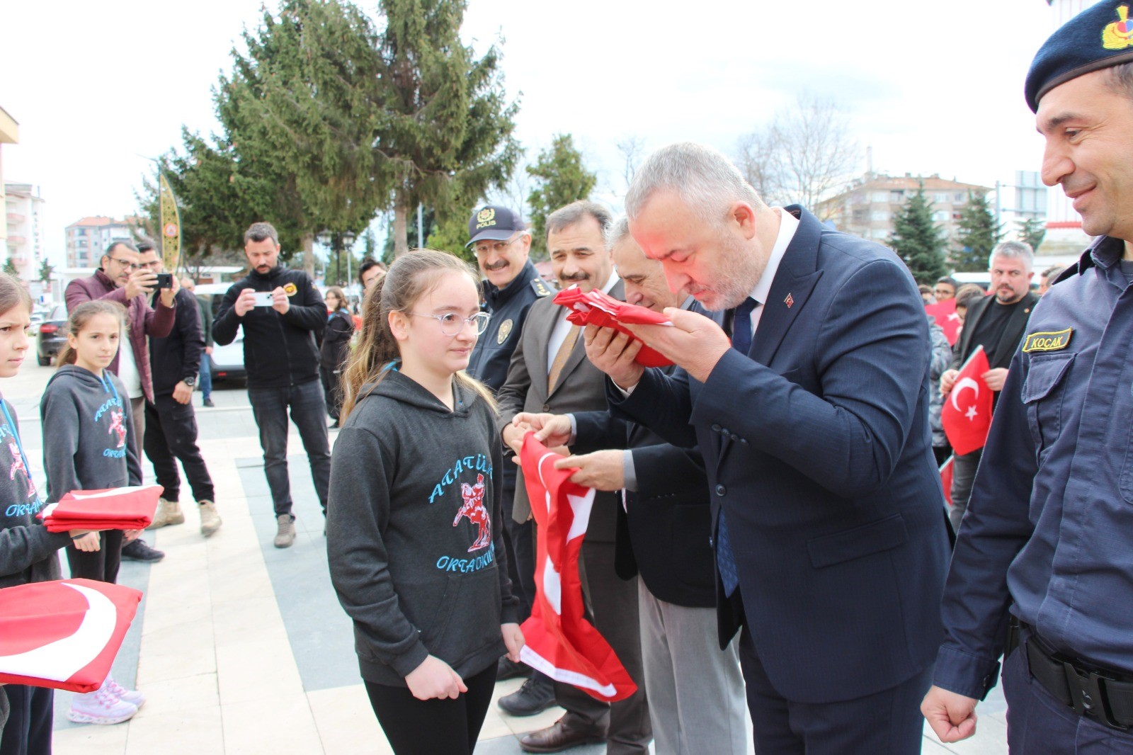 Törenin sonunda öğrenciler tarafından Kaymakam Haluk Şimşek, Emniyet Müdürü Ahmet Şahin, İlçe Jandarma Komutanı Adem Koçak ve İlçe Milli Eğitim Müdürü Ömer Demirkol’a Türk bayrağı takdim edildi.