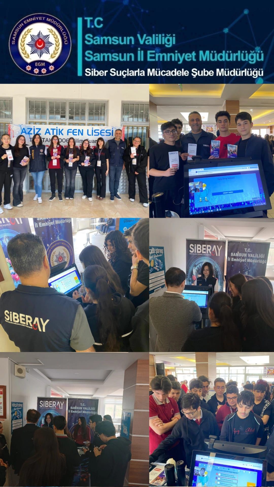 Samsun İl Emniyet Müdürlüğü Siber Suçlarla Mücadele Şube Müdürlüğü ekiplerince yürütülen SİBERAY Programı kapsamında, 28 Nisan 2026 tarihinde Aziz Atik Fen Lisesi’nde gerçekleştirilen TÜBİTAK 4006 Bilim Şenliği’nde farkındalık etkinliği düzenlendi.
