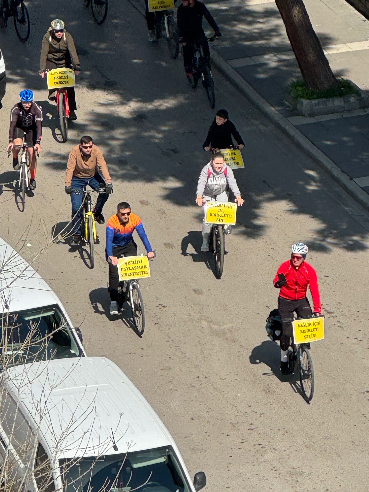 Bisikletliler, sürüş sırasında bisikletlerine "Trafik sorununu bisiklet çözecek", "Arabadan in bisiklete bin", "Şeridi paylaşmak medeniyettir", "Trafikte biz de varız" ve "Beni de ailem bekliyor" yazılı pankartlar astı.