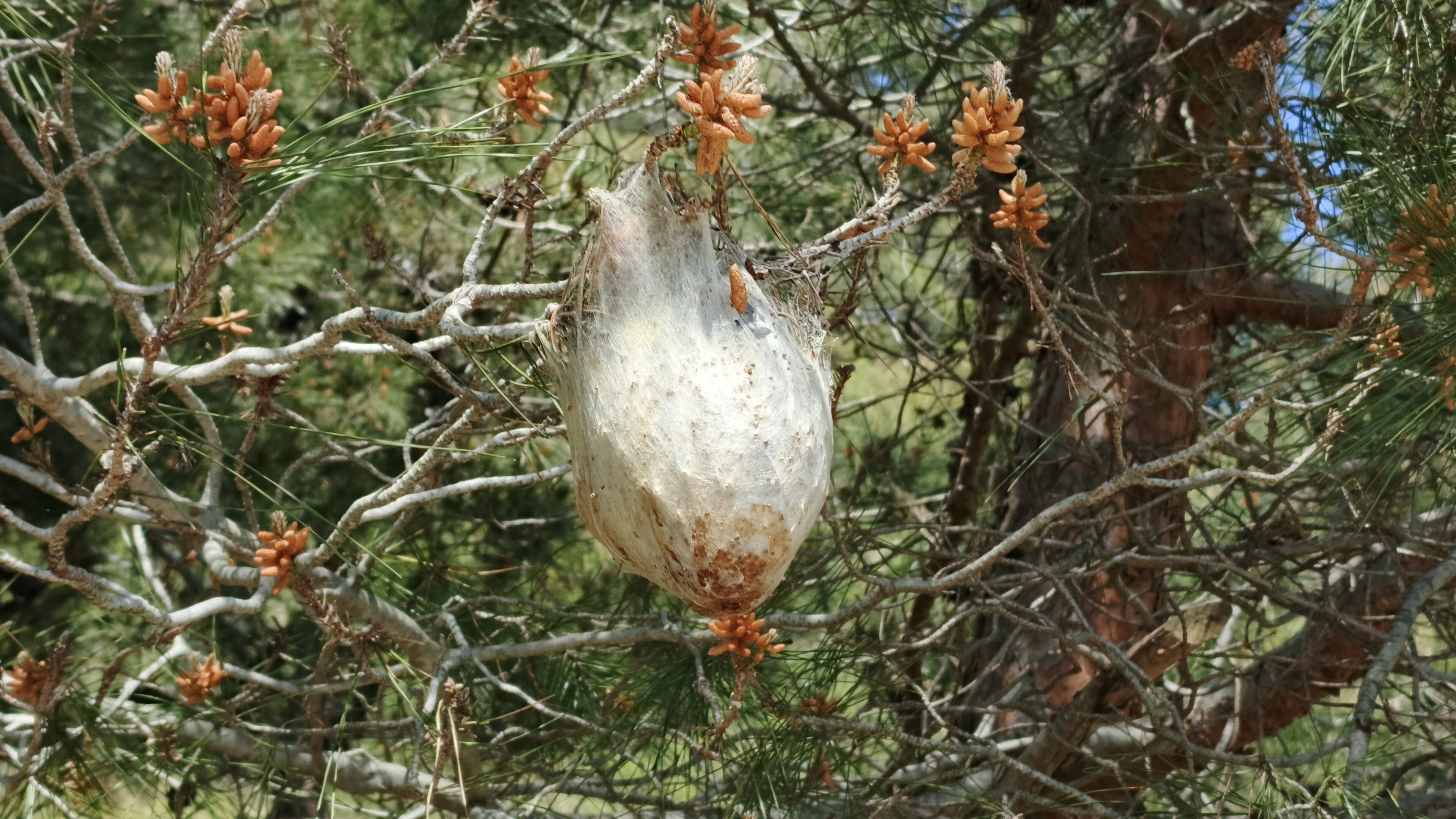 Dallar üzerinde oluşan beyaz, pamuksu yapılar hem doğa yürüyüşü yapan vatandaşların hem de bölgeden geçen sürücülerin dikkatini çekiyor. Görüntü kirliliğine de neden olan bu yapılar, zararlının yayılımını gözler önüne seriyor.
