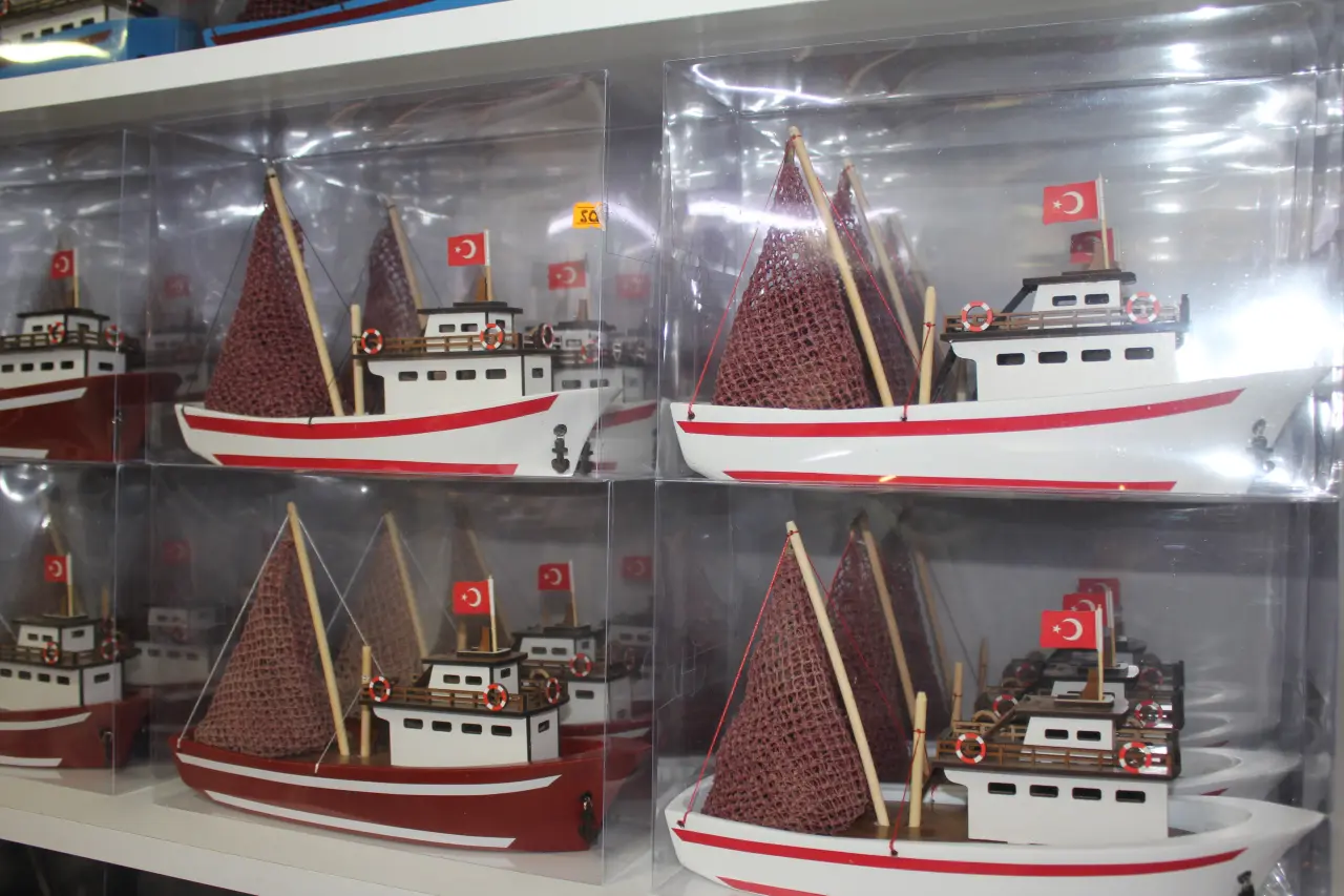 Bayraktar'ın atölyesinde, boyutuna ve detayına göre yapımı iki gün ile bir ay arasında değişen 8-10 çeşit balıkçı takası ve taraftar temalı tekne modeli bulunuyor. Her geminin yapım süreci farklı bir emek gerektiriyor. Ürünlerini toptan vermenin yanı sıra, dükkânında perakende olarak satışa sunuyor.