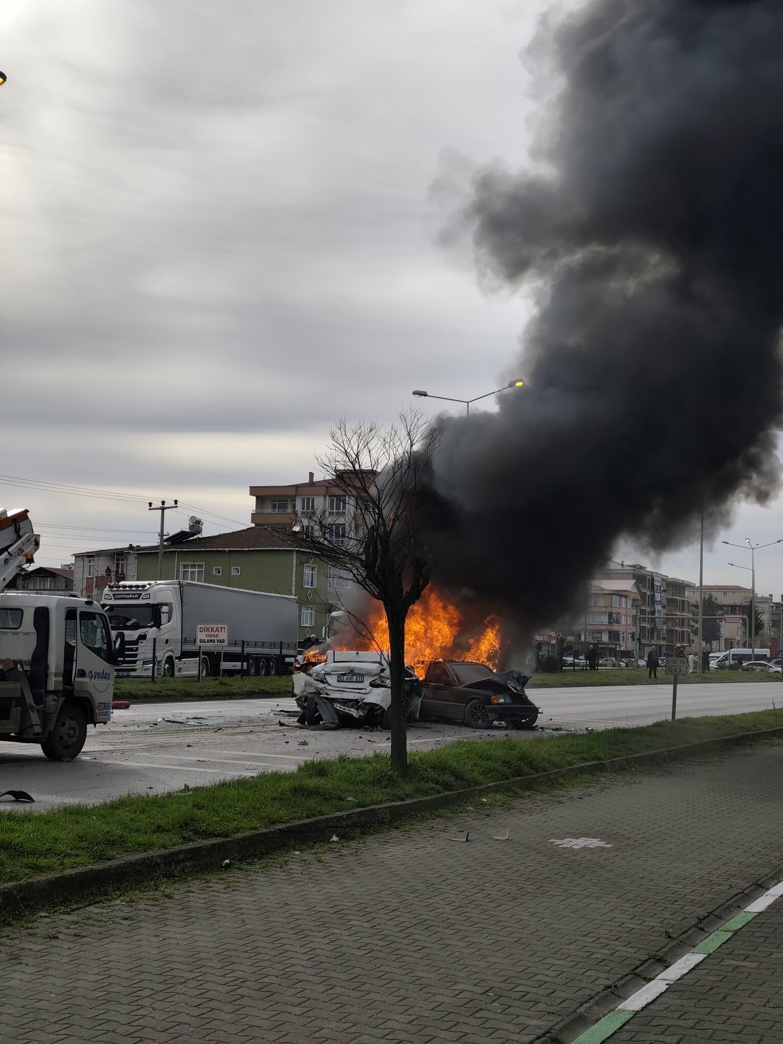 Samsun’un Çarşamba ilçesi Mustafa Güneşdoğdu Kampüsü Kavşağı’nda 5 aracın karıştığı zincirleme trafik kazasında 3 araba alev aldı.