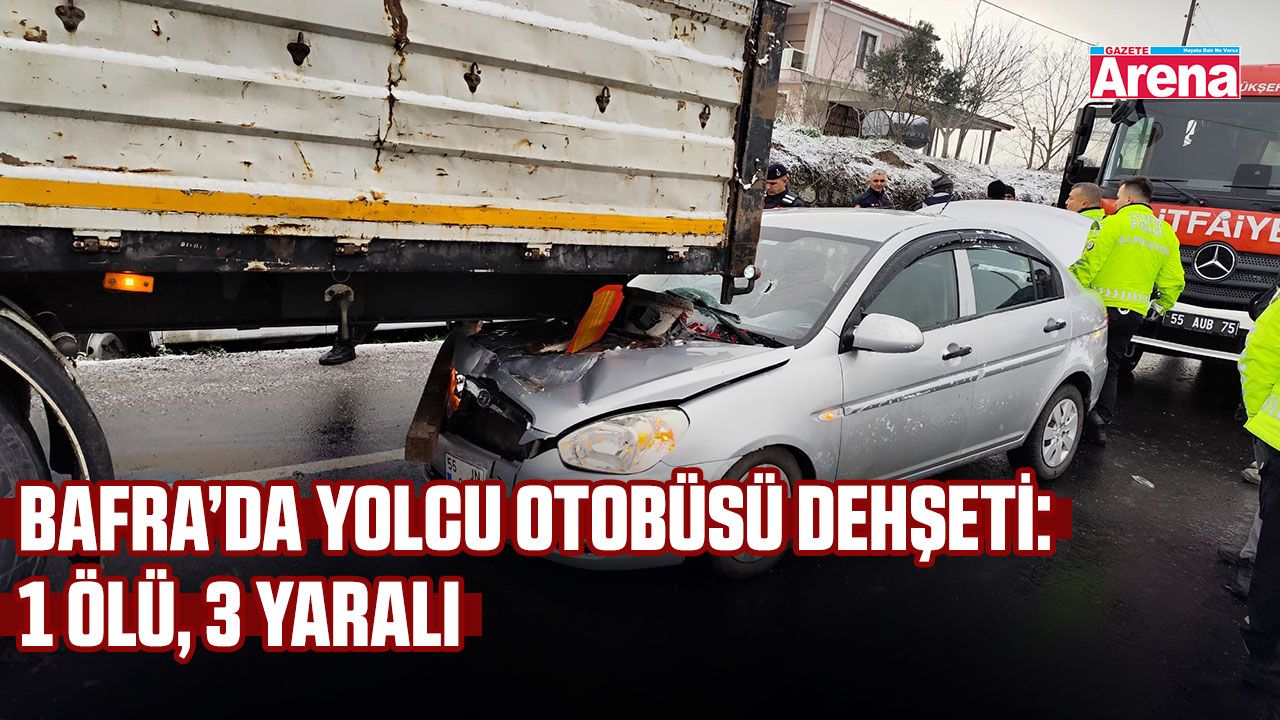 Samsun’un Bafra ilçesinde yolcu otobüsünün çarpması sonucu 1 kişi yaşamını yitirirken, 3 kişi de yaralandı. Kaza, Sinop–Samsun kara yolu Elifli Mahallesi mevkisinde meydana geldi. İki aracın karıştığı hasarlı kaza sonrası yolun sağ tarafında bekleyen kişilere, E.Ü. yönetimindeki 57 AB 714 plakalı yolcu otobüsü çarptı. Otobüs çarpmanın ardından istinat duvarına çarparak durabildi.