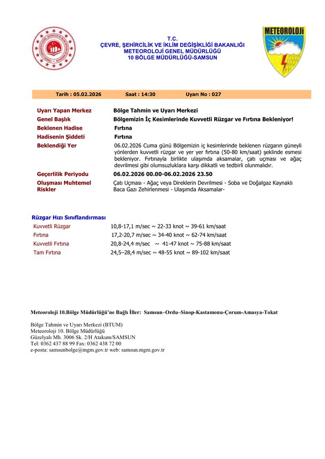 Meteoroloji Genel Müdürlüğü 10. Bölge Müdürlüğü (Samsun), bölgenin iç kesimleri için kuvvetli rüzgar ve fırtına uyarısında bulundu. Yapılan açıklamada, vatandaşların olumsuz hava koşullarına karşı dikkatli ve tedbirli olmaları istendi.