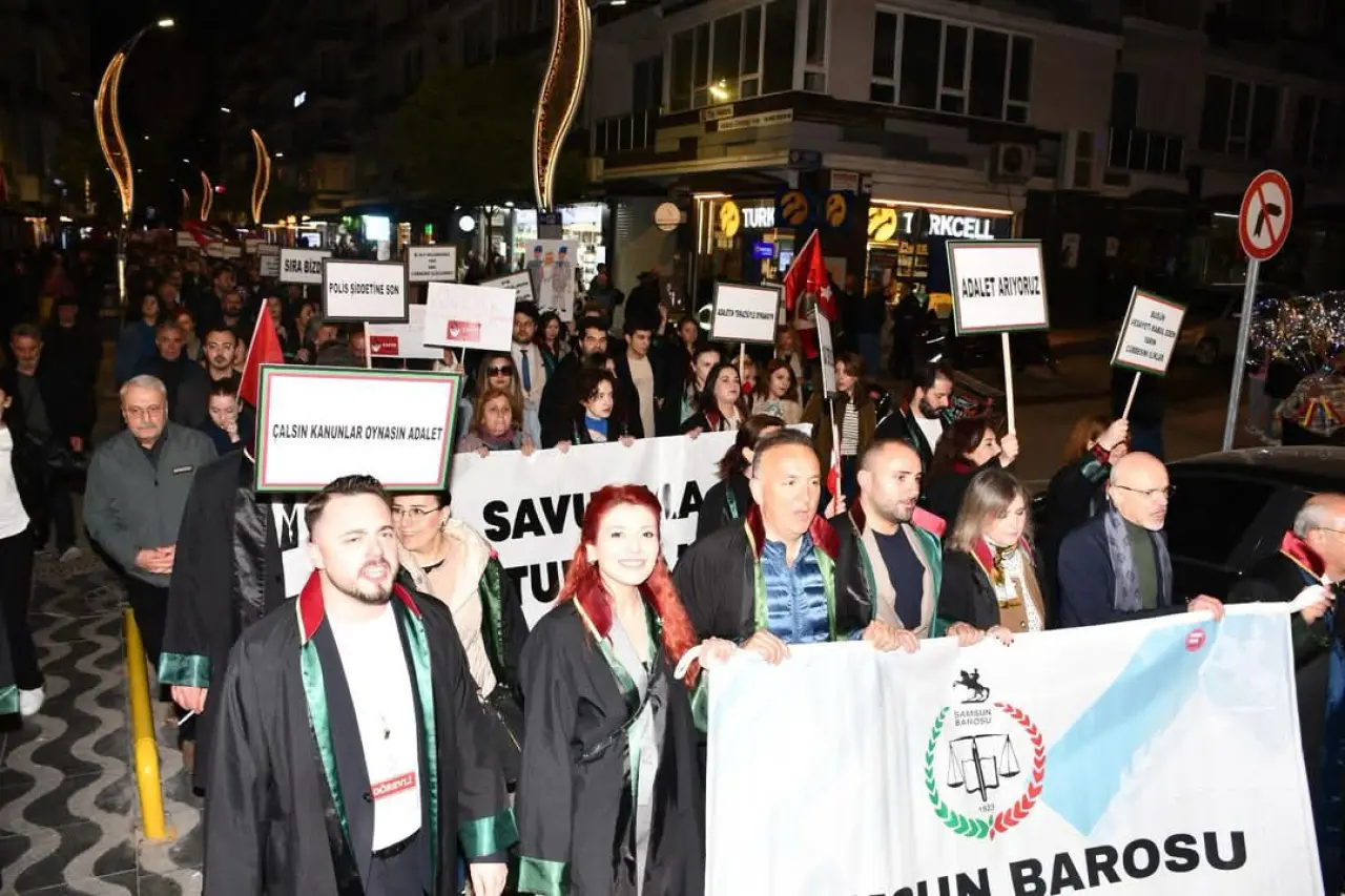 Samsun'da hukukçular yürüyüş düzenledi. Dün akşam saat 20.00'da adliye binası önünde toplanan kalabalık, İstiklal Caddesi üzerinden Atatürk Parkı'na yürüdü. Yürüyüşe, sivil topluk örgütü üyeleri, çeşitli siyasi partilerden üyeler ve çok sayıda vatandaş katılırken, "Savunma susturulamaz”, “Savunma hakkı engellenemez”, “Susma, sustukça sıra sana gelecek”, “Kurtuluş yok tek başına, ya hep beraber ya hiçbirimiz”, “Direne direne kazanacağız” şeklinde slogan atıldı.