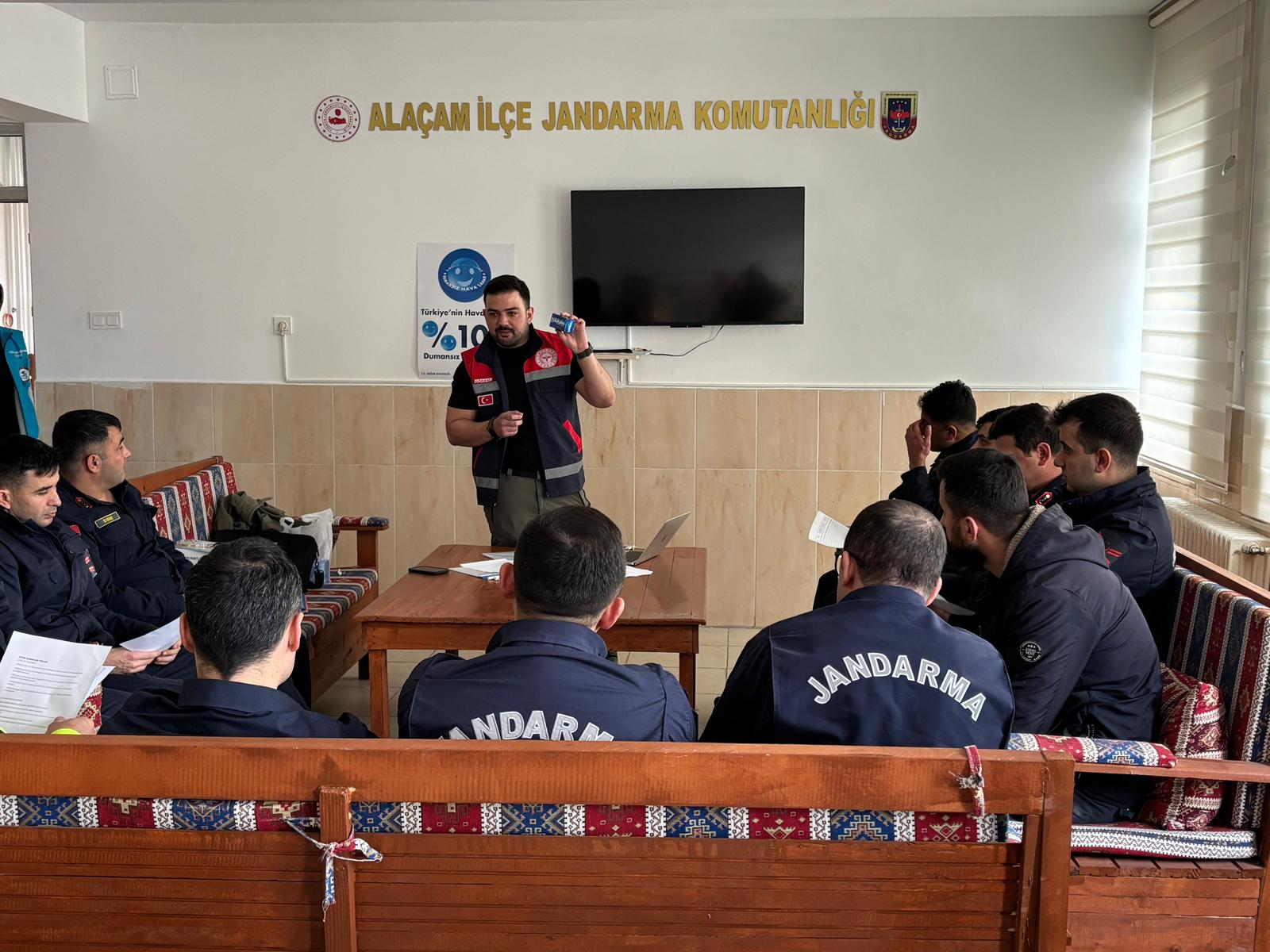 Samsun İl Sağlık Müdürlüğü tarafından yürütülen “Yerinde Sigara Bıraktırma Danışmanlığı ve Mobil Tütünle Mücadele Hizmeti” kapsamında Alaçam ilçesinde farkındalık çalışması gerçekleştirildi. Alaçam İlçe Toplum Sağlığı Merkezi Başkanı Dr. Alperen Cantürk ve ekibi, İlçe Jandarma Komutanlığı personeline yönelik bilgilendirme ve eğitim faaliyeti düzenledi.