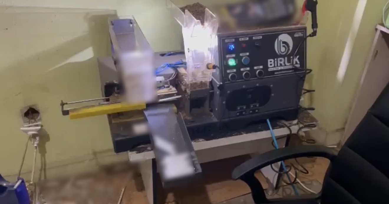 Yapılan aramalarda 10 bin adet makaron sigara, 1 adet otomatik sigara sarma makinesi ve 1 adet kompresör ele geçirildi.