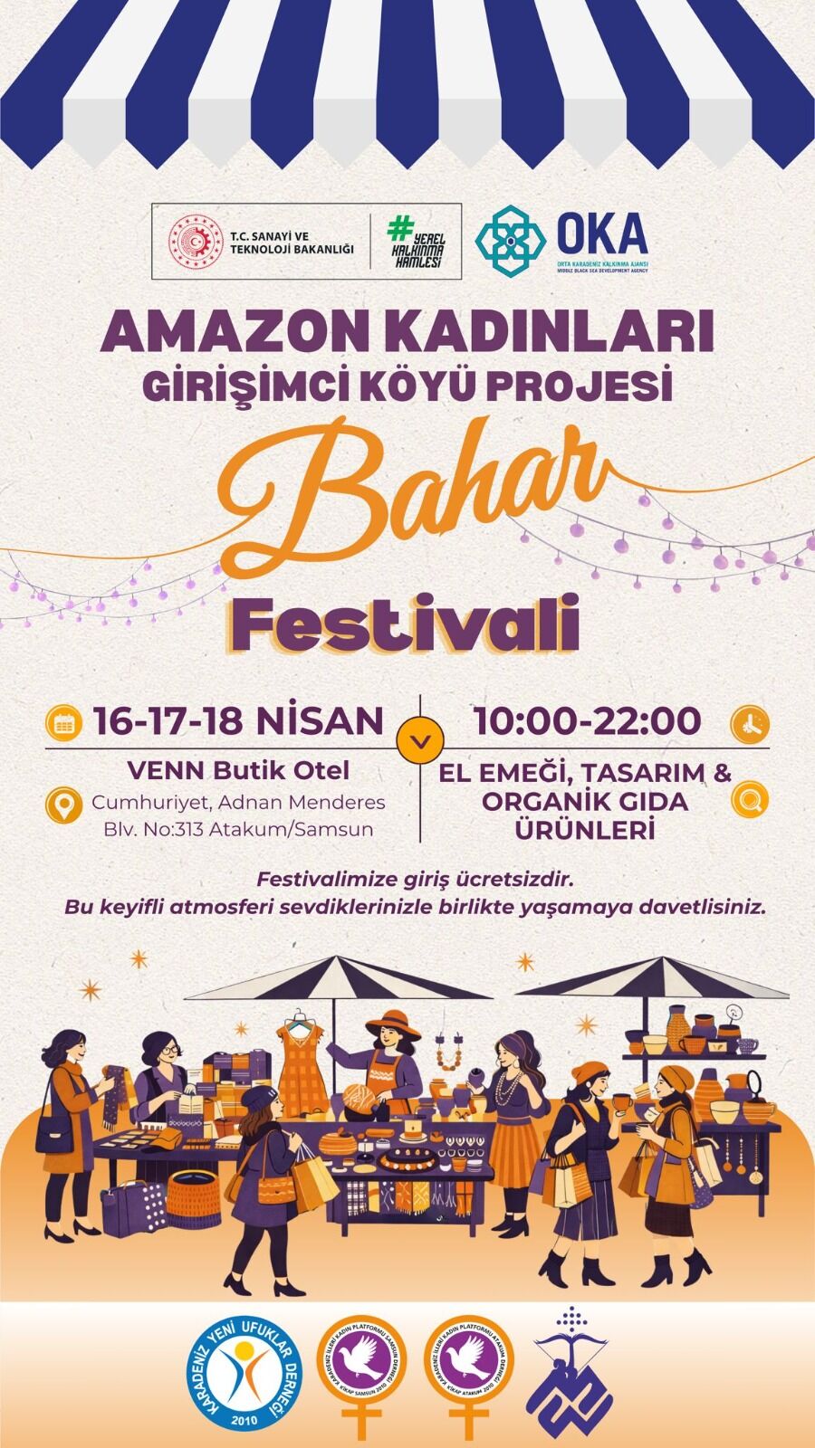 Orta Karadeniz Kalkınma Ajansı (OKA) desteğiyle yürütülen "Amazon Kadın Girişimcileri Köyü Projesi" kapsamında, girişimci kadınlar tarafından "Bahar Festivali" düzenlenecek. Proje çerçevesinde eğitimlerini tamamlayan kadınların üretimlerini ve kazanımlarını görünür kılmayı amaçlayan etkinlik, 16-17-18 Nisan tarihlerinde Venn Butik Otel'de gerçekleştirilecek.