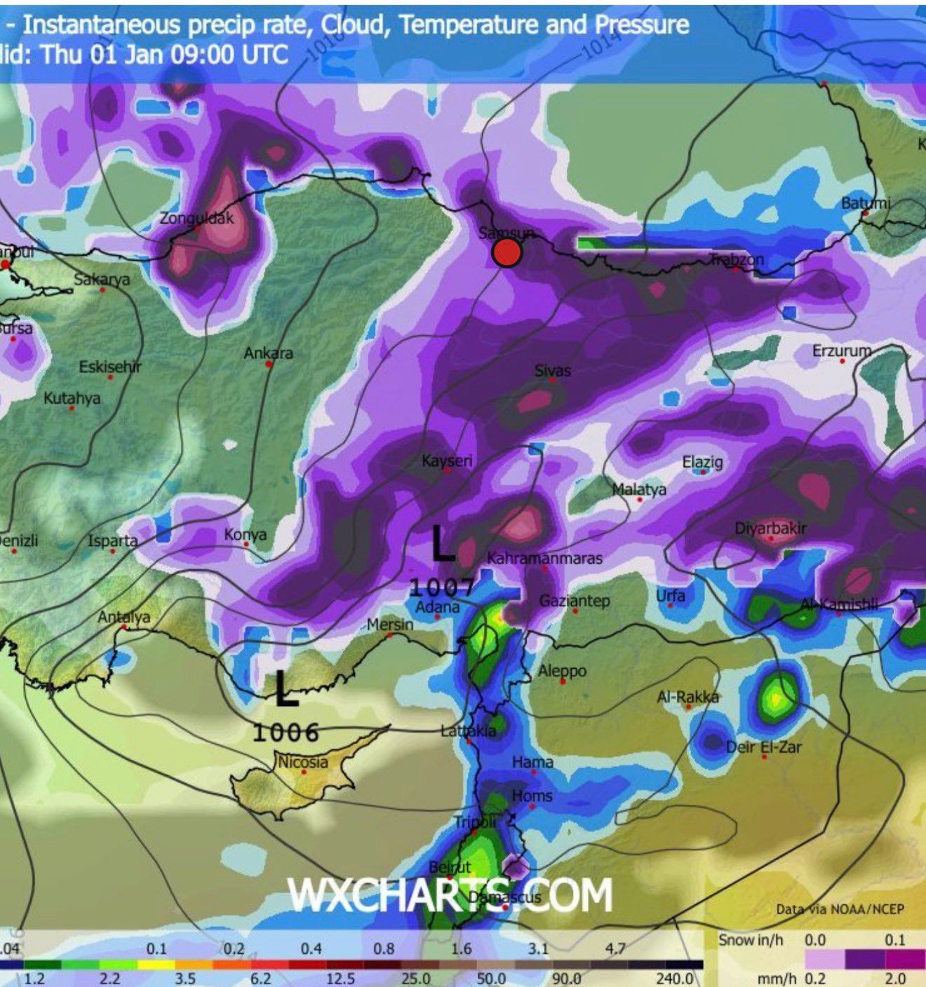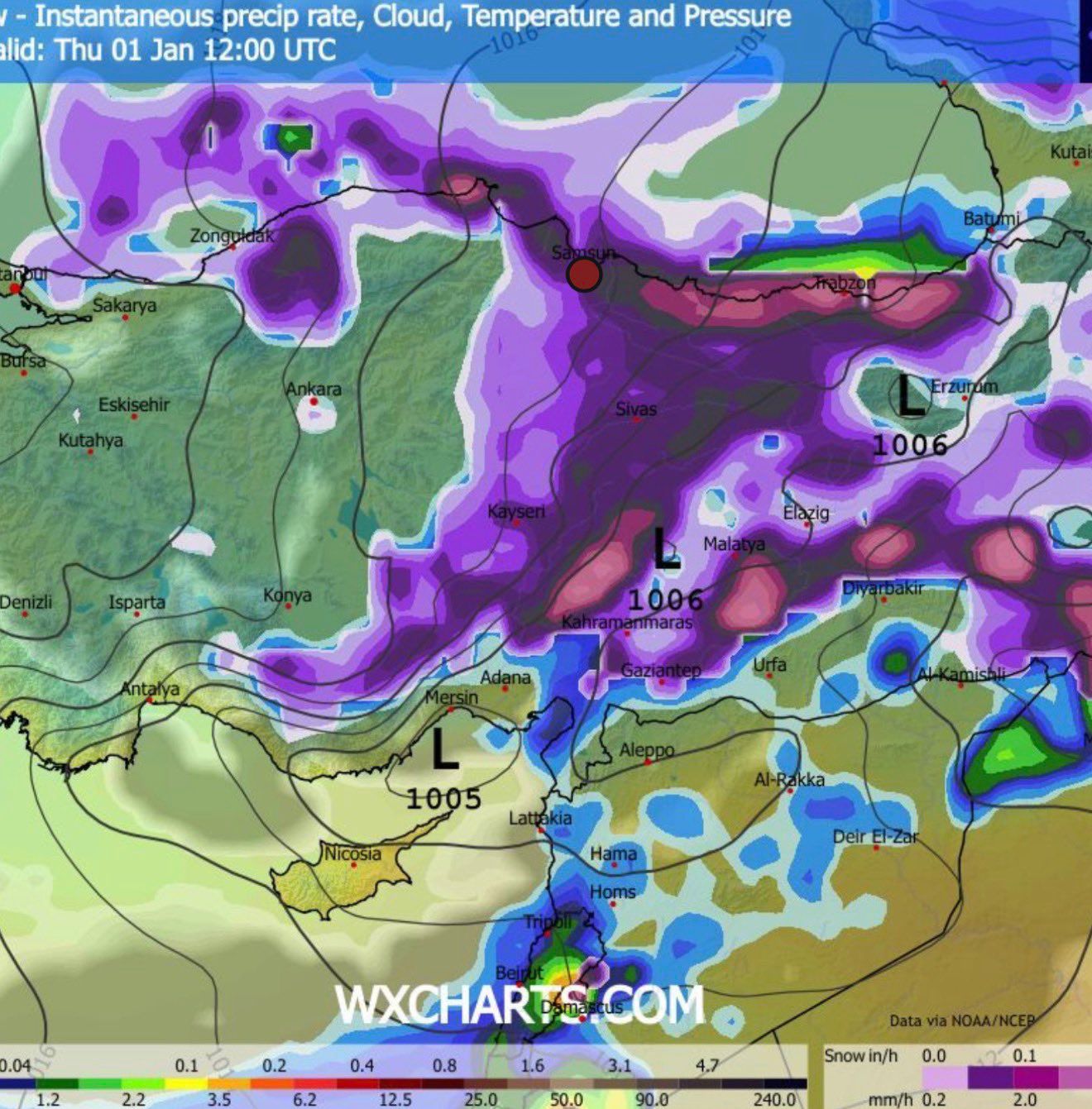 GFS (Global Forecast System – Küresel Tahmin Sistemi) modelinin son verilerine göre, Samsun genelinde 1 Ocak günü kar yağışında artış bekleniyor. Sabah saat 09:00 civarında başlayacak yağışların gün boyu etkili olması ve akşam saat 21:00’e kadar devam etmesi öngörülüyor.