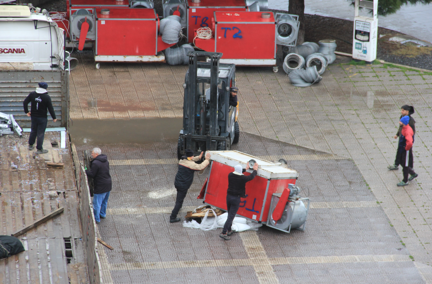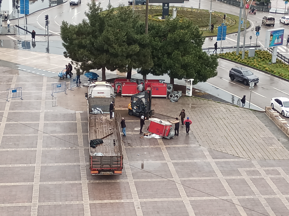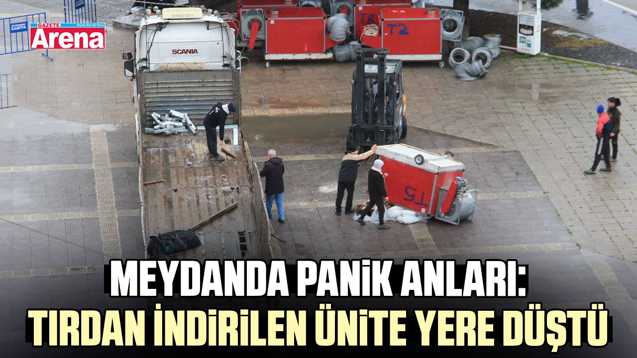 Samsun Cumhuriyet Meydanı’nda gerçekleşen yük indirme çalışmaları sırasında yaşanan olay, kısa süreli panik yarattı. Ramazan çadırında kullanılmak üzere tırla getirilen havalandırma ünitelerinden biri forkliftle indirilirken devrildi.