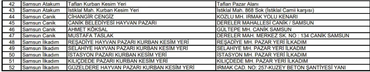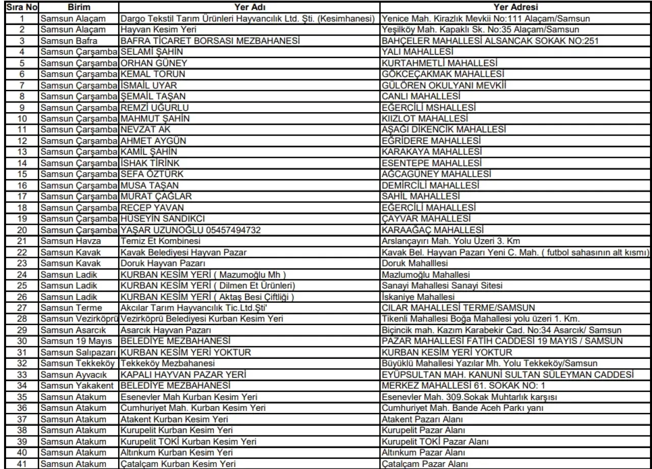 İşte Samsun’da belediyelerce duyurulan 2025 yılı Kurban Bayramı resmî kurban kesim alanlarının bazıları: