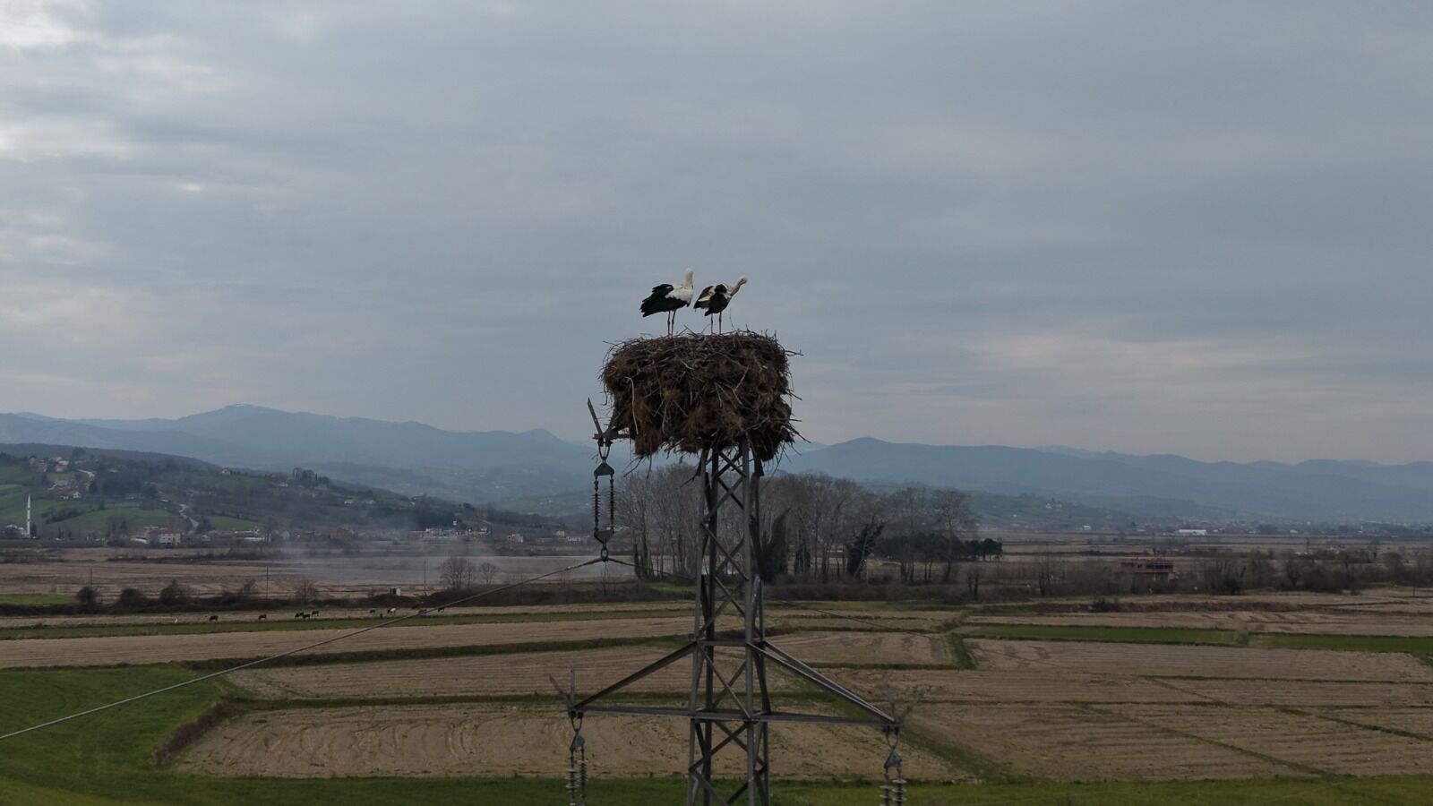 Samsun’un Alaçam ilçesinde, baharın müjdecisi olarak bilinen leylekler, yüksek gerilim hattı direklerine kurdukları yuvalarla doğaseverlerin ilgisini çekti.