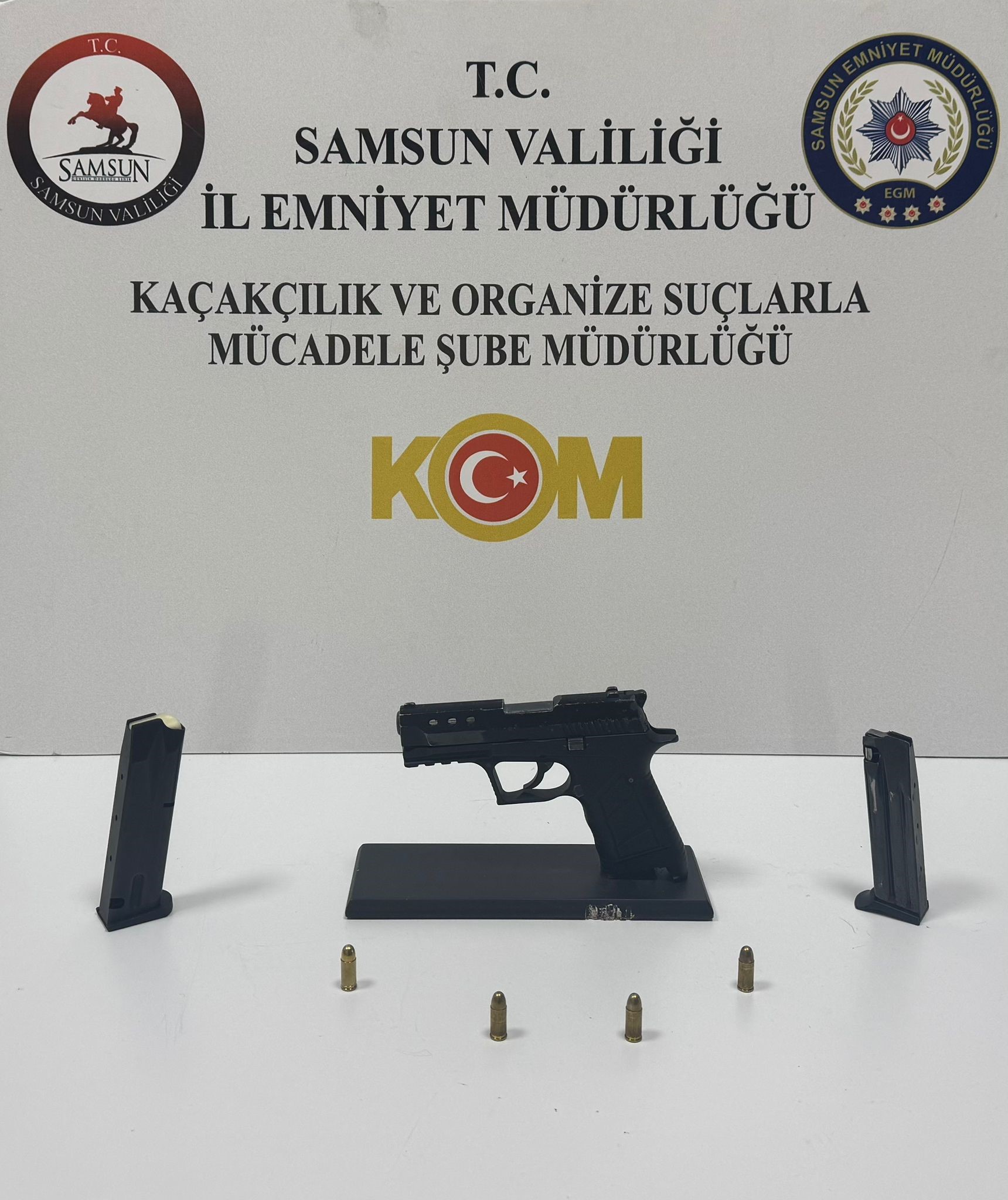 Şüphelilerin üzerlerinde ve araçlarında yapılan aramalarda 1 adet ruhsatsız tabanca, şarjörler ve çeşitli dijital materyaller ele geçirildi.