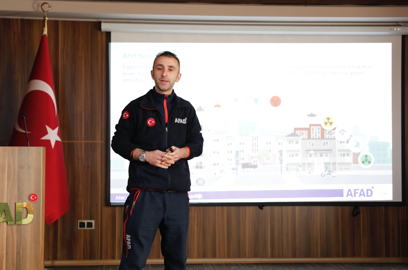 Samsun İl Afet ve Acil Durum Müdürlüğü Toplantı Salonu'nda gerçekleşen programda öğrencilere deprem öncesi ve sonrası yapılması gerekenler, temel arama kurtarma bilgileri ve uygulamalı eğitim verildi.