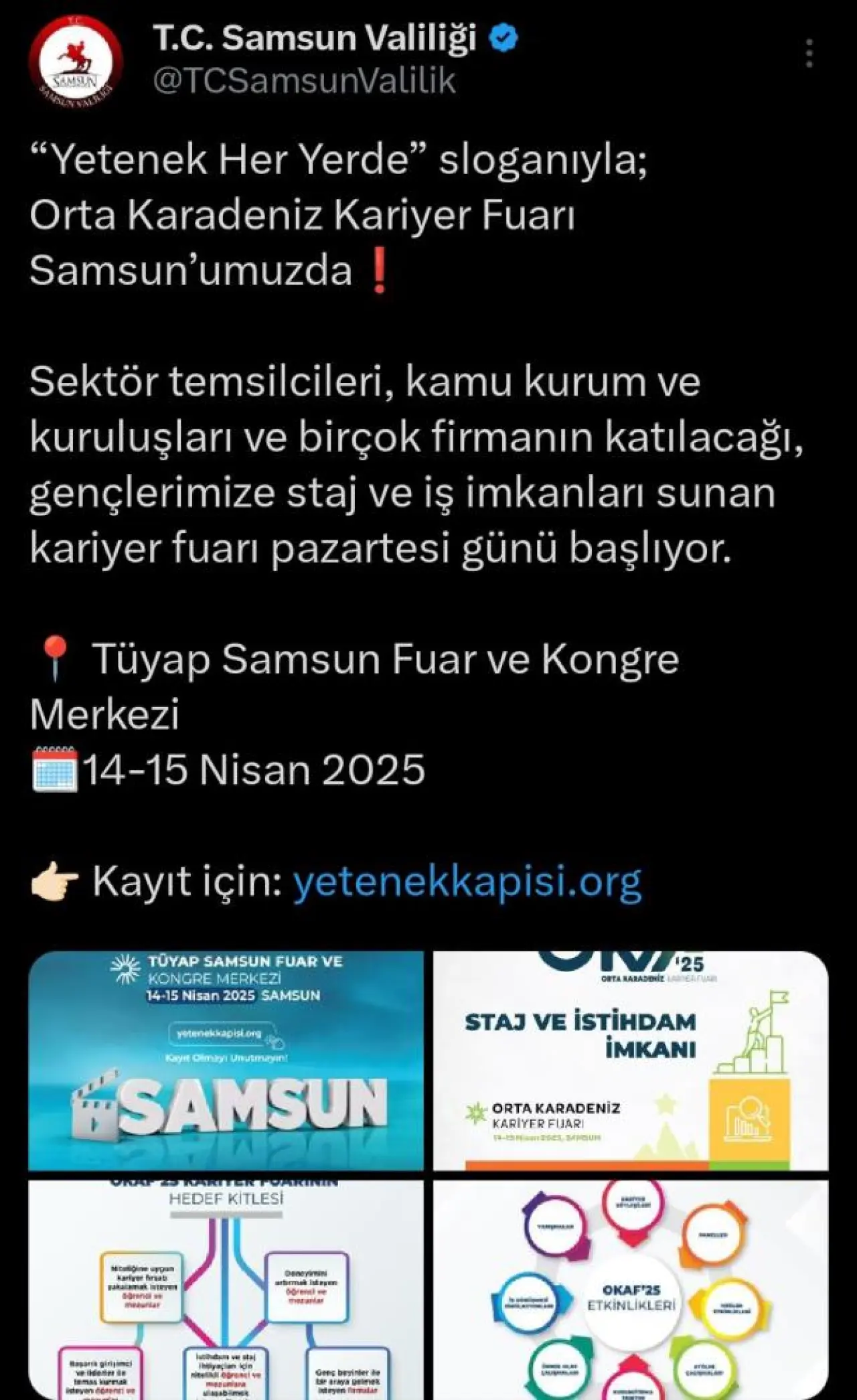 Samsun Valiliği sosyal medya hesapları üzerinden gerçekleştirilen paylaşımda, "'Yetenek Her Yerde' sloganıyla Orta Karadeniz Kariyer Fuarı Samsun’umuzda. Sektör temsilcileri, kamu kurum ve kuruluşları ve birçok firmanın katılacağı, gençlerimize staj ve iş imkanları sunan kariyer fuarı pazartesi günü başlıyor" denildi.