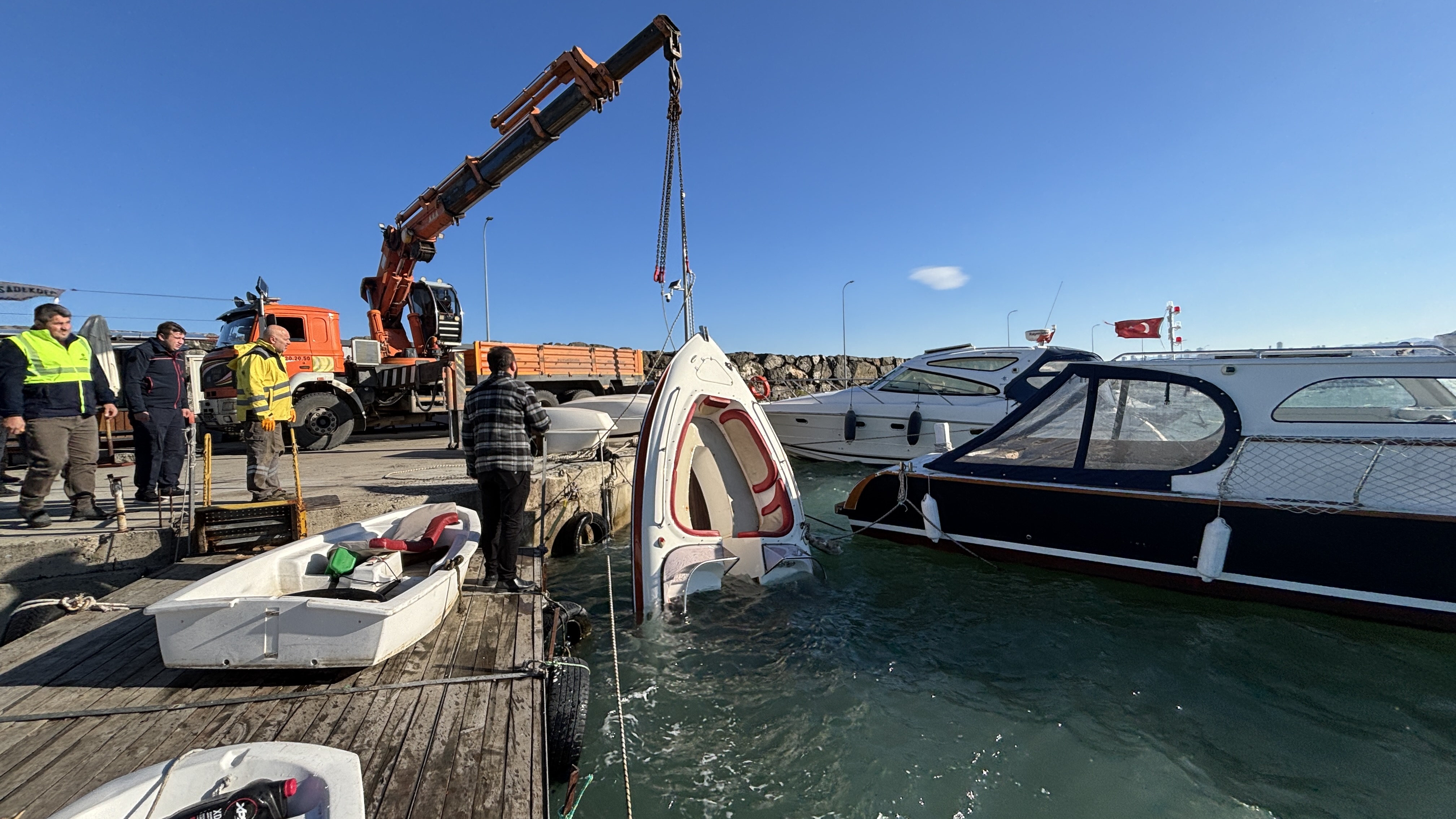 Tekne, vinç yardımıyla yeniden su yüzeyine çıkarıldı.