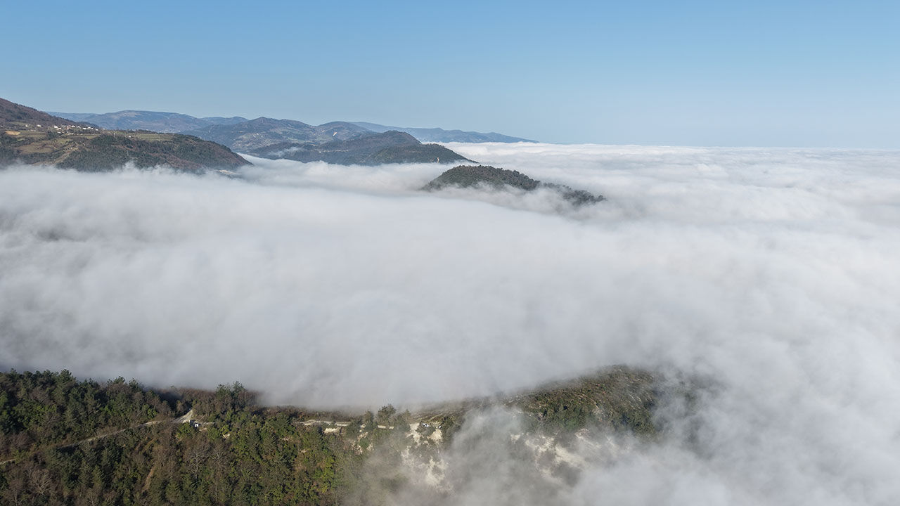 Yakakent ile Sinop’un Gerze ilçesini birbirine bağlayan kara yolunun geçtiği bölge, yeşilin ve mavinin buluştuğu doğal güzellikleriyle dikkat çekiyor. Üst kısmı ormanlarla kaplı dağlardan Karadeniz’e doğru inen sis, sahil hattını tamamen gizleyerek ortaya eşsiz bir “sis denizi” manzarası çıkardı.